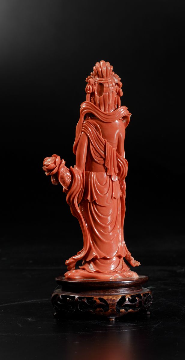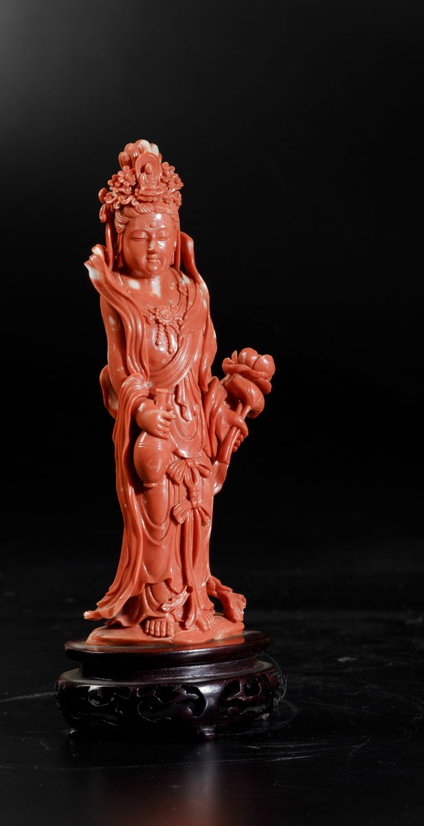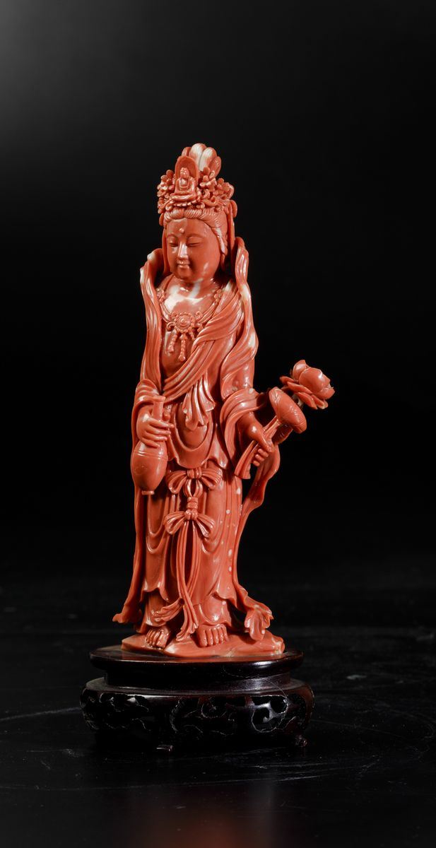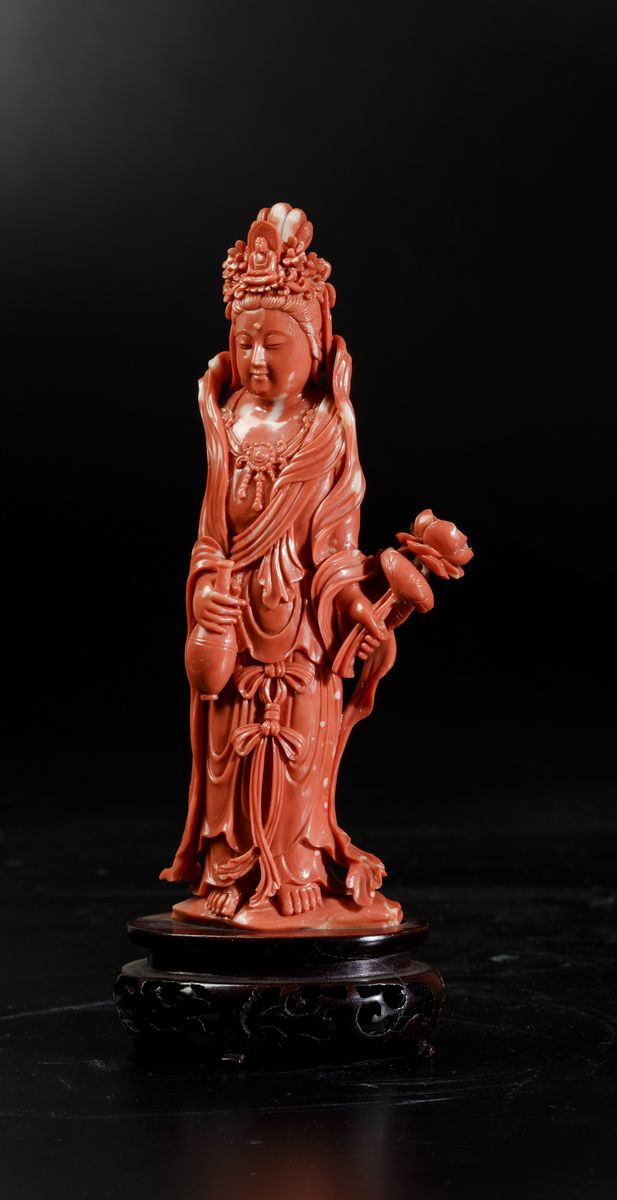 A figure of crowned Guanyin with a small vase and flower carved in coral. Gross weight 563g; H 21cm