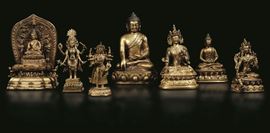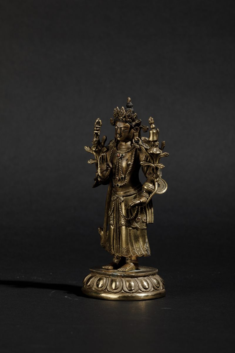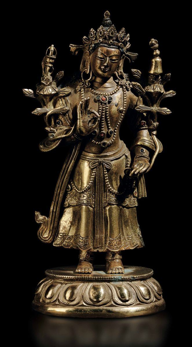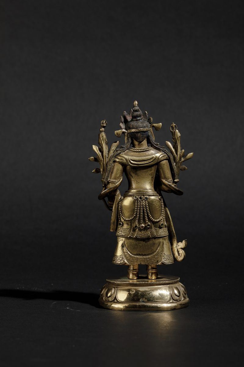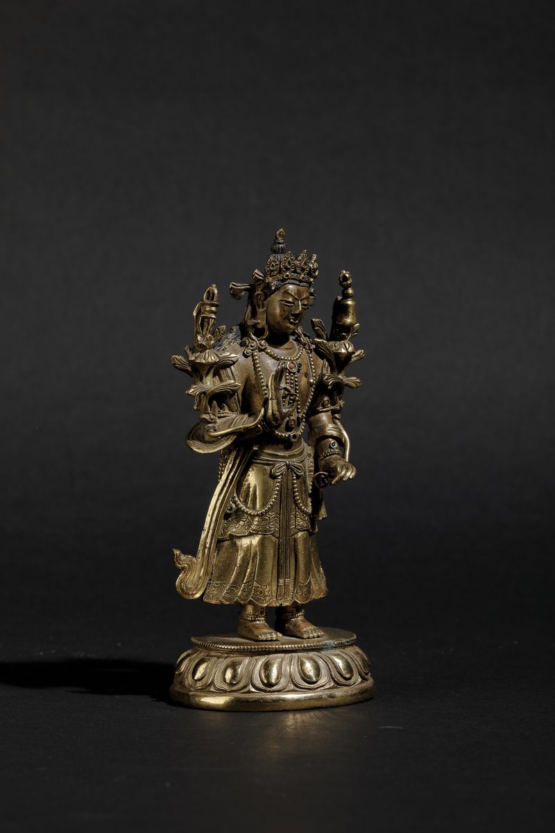 A figure of Tara standing on a lotus flower in gilded bronze with semi-precious stone inlays. H 14.5cm