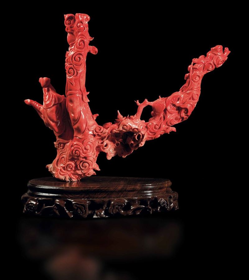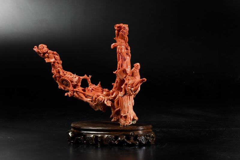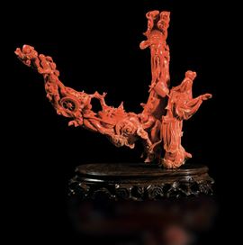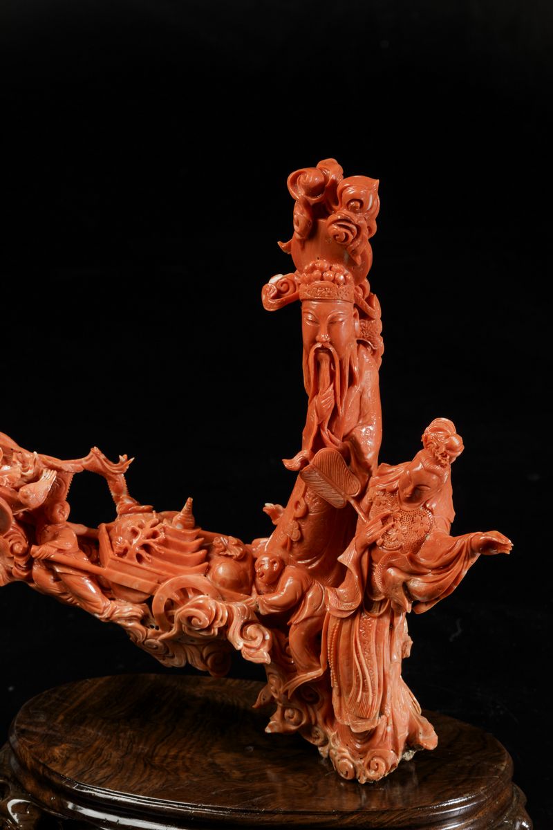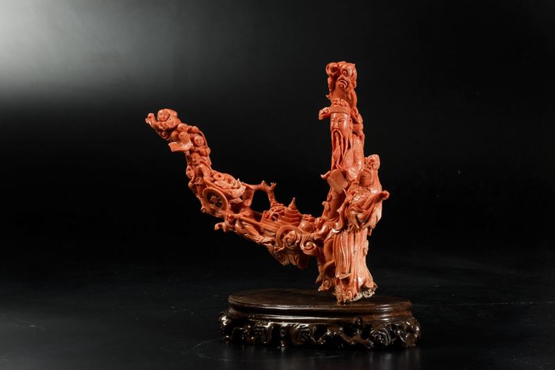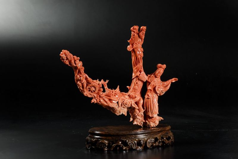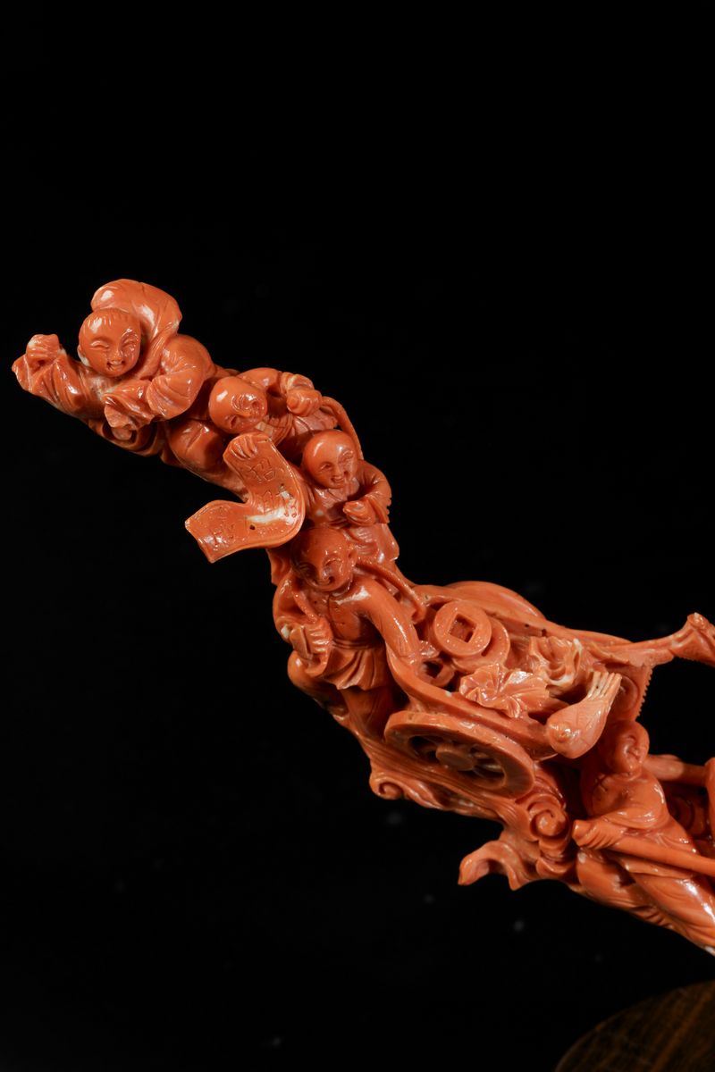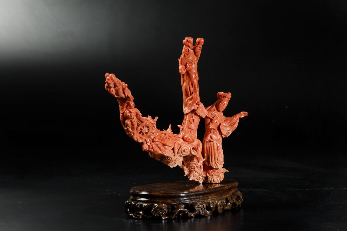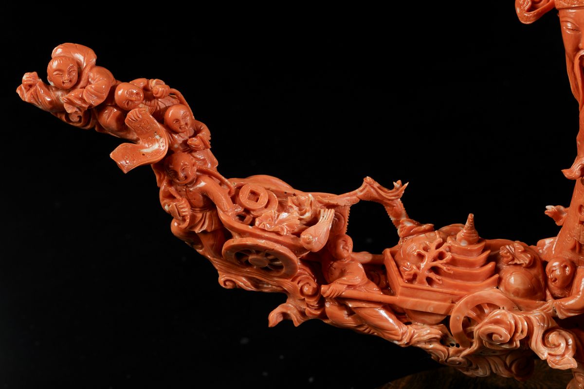 A large branch made of coral and finely carved depicting Guanyin with cart and children. 1630g; 28x34cm
