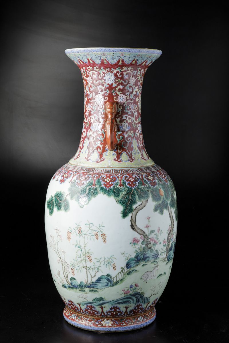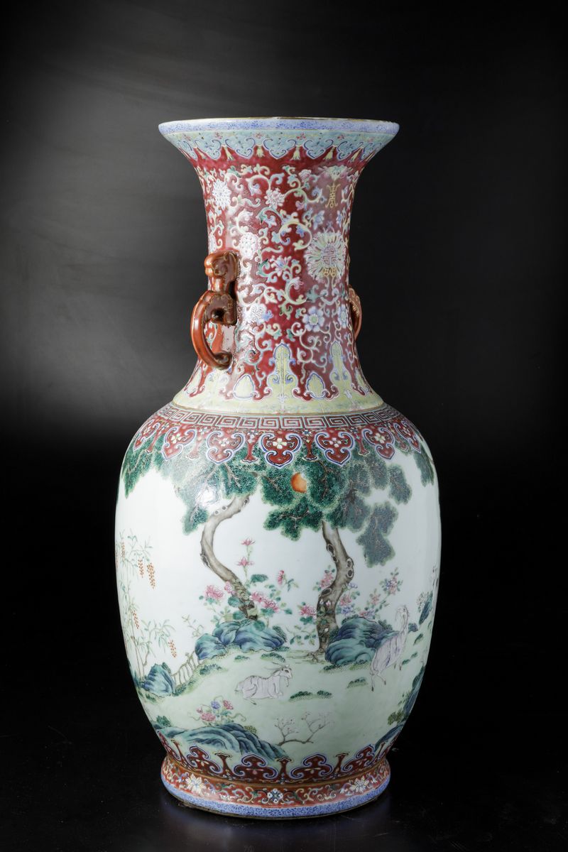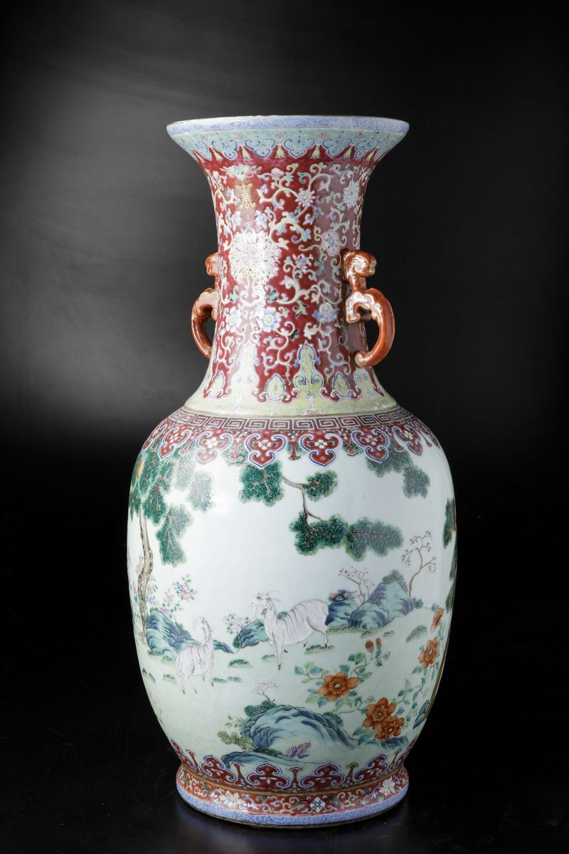 A vase in porcelain of the Famille-Rose with molded handles, Taoist symbols and grazing goats within a landscape, Daoguang period (1821-1850). H 72cm
