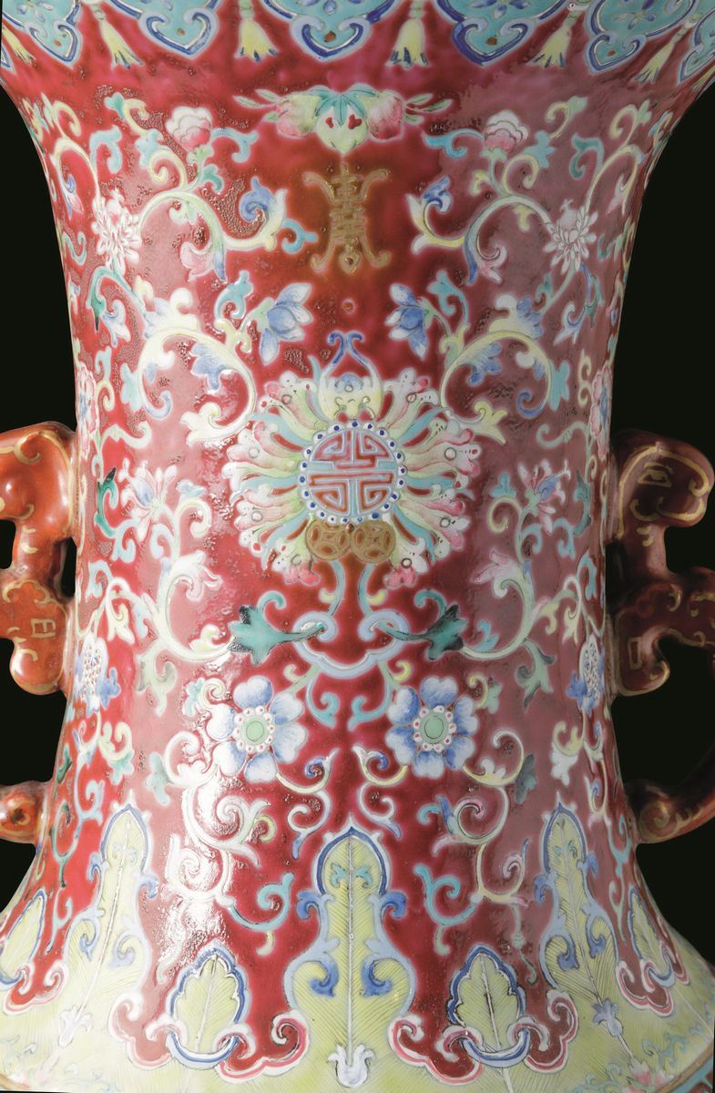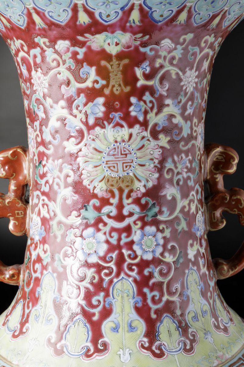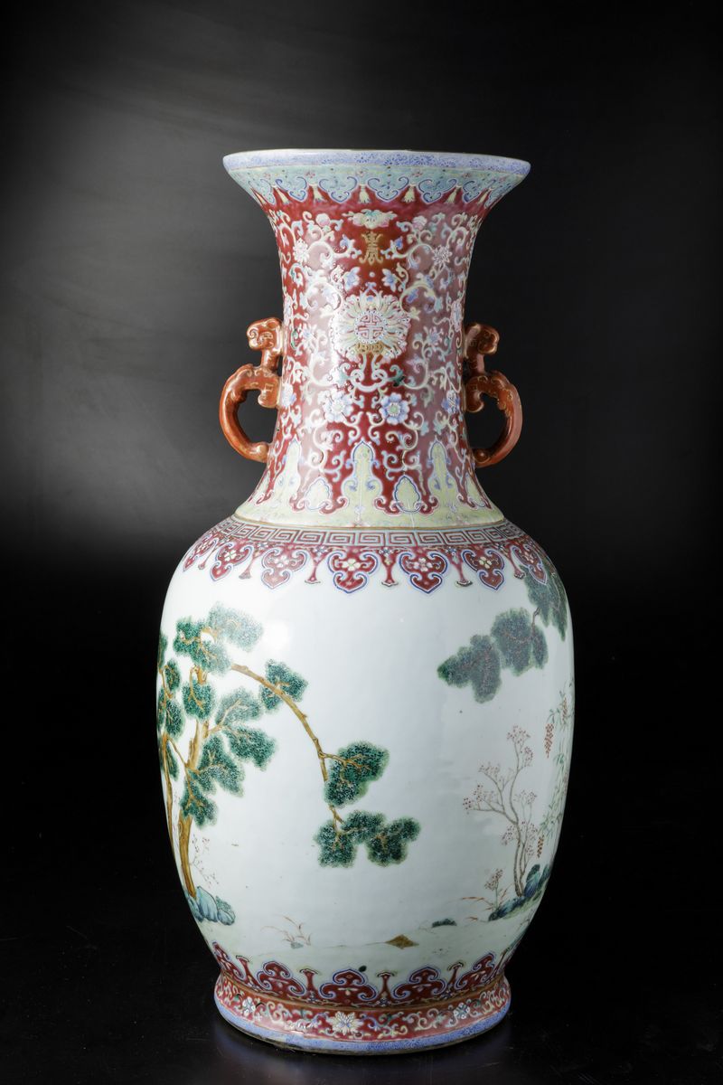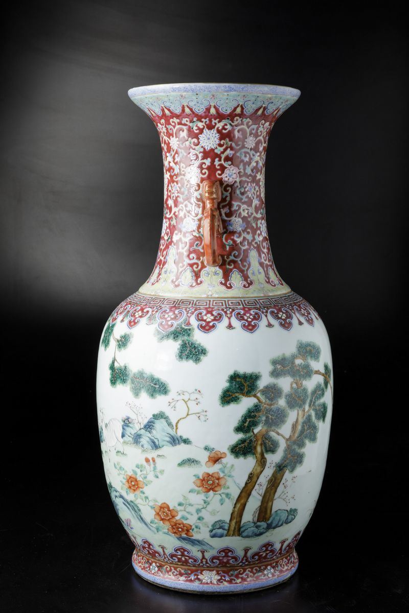 A vase in porcelain of the Famille-Rose with molded handles, Taoist symbols and grazing goats within a landscape, Daoguang period (1821-1850). H 72cm