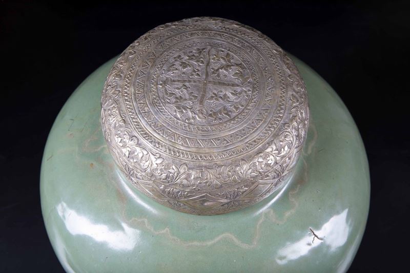 A large vase in Longquan Celadon porcelain with lid in embossed and chiselled silver lid. H 39cm, with mark.