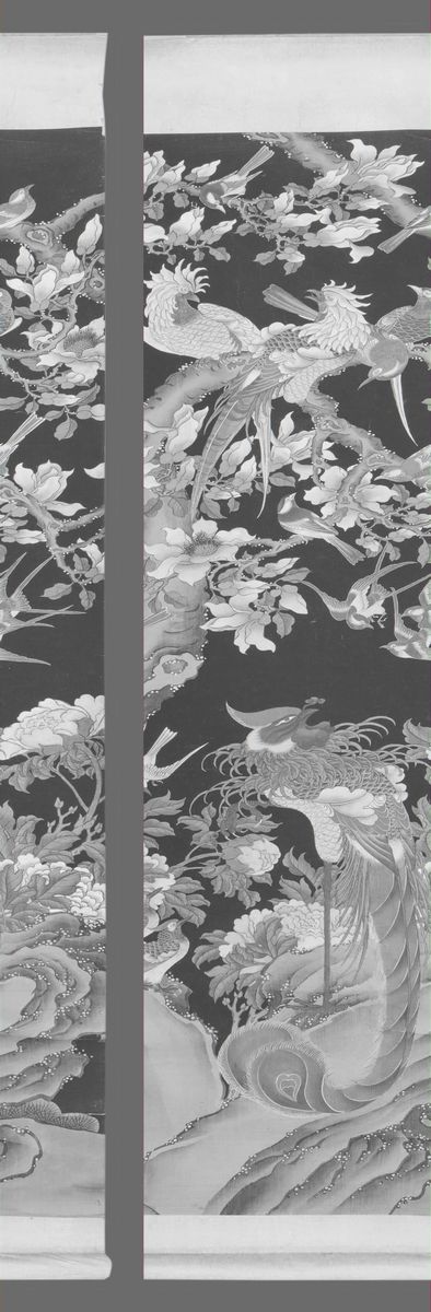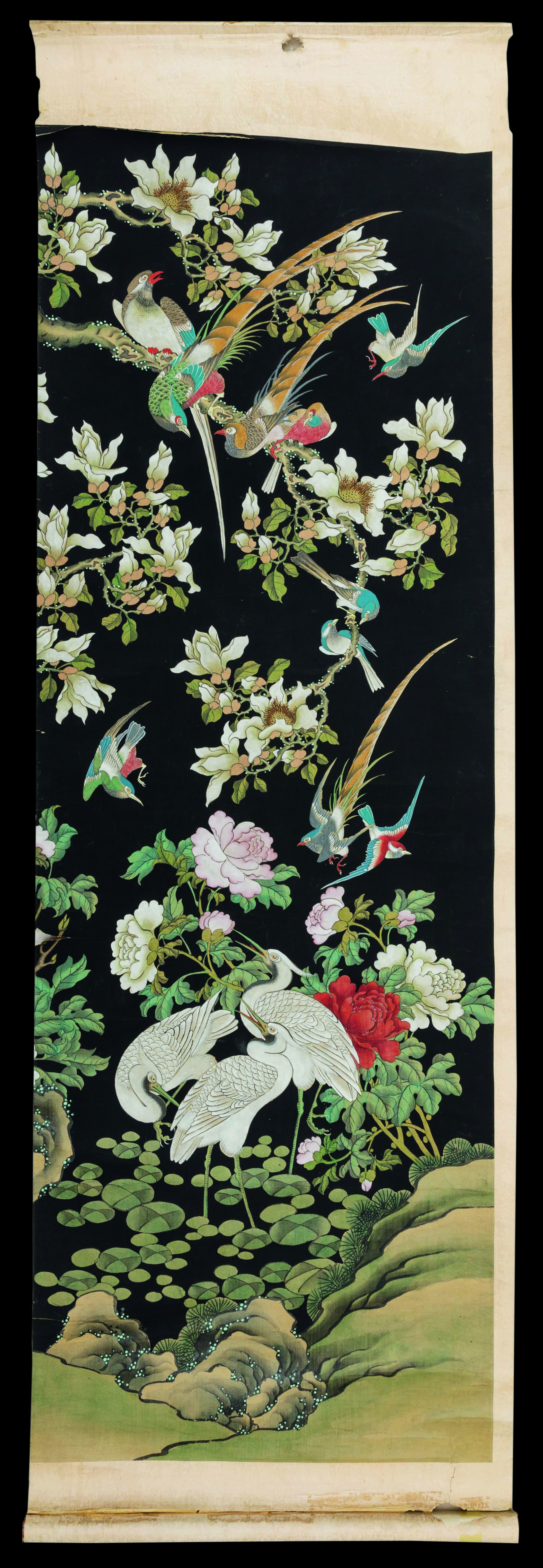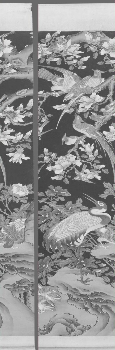 A painting in four scrolls on paper depicting nature scenes with birds, blooming branches and inscriptions. 159x55cm each.