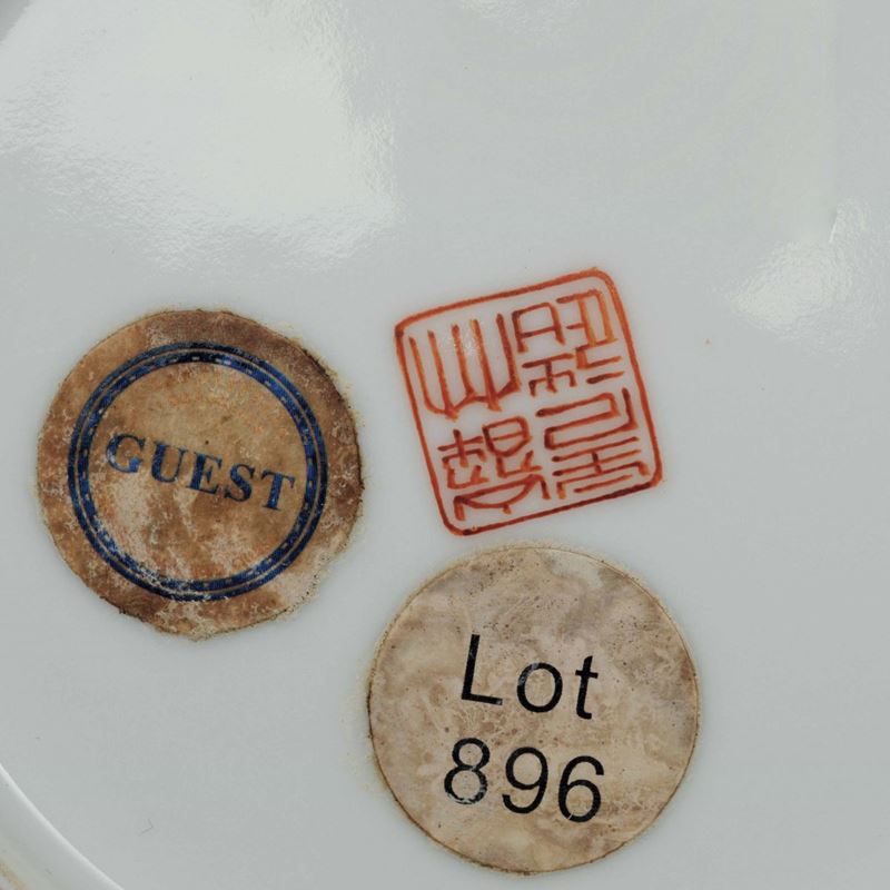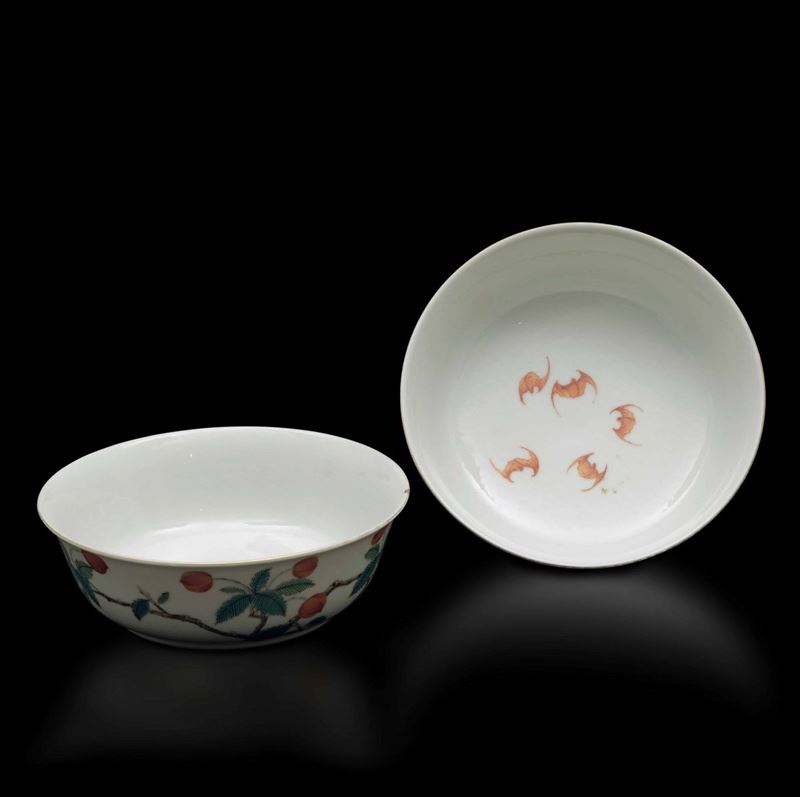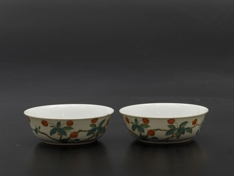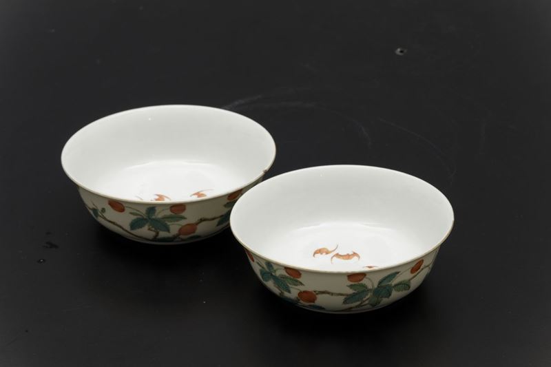 A pair of bowls in porcelain with decorations of peaches and bats. 4.5x14cm with mark
