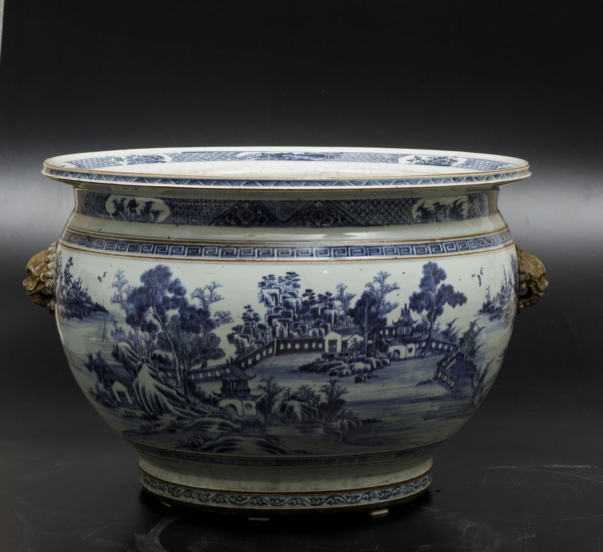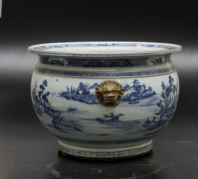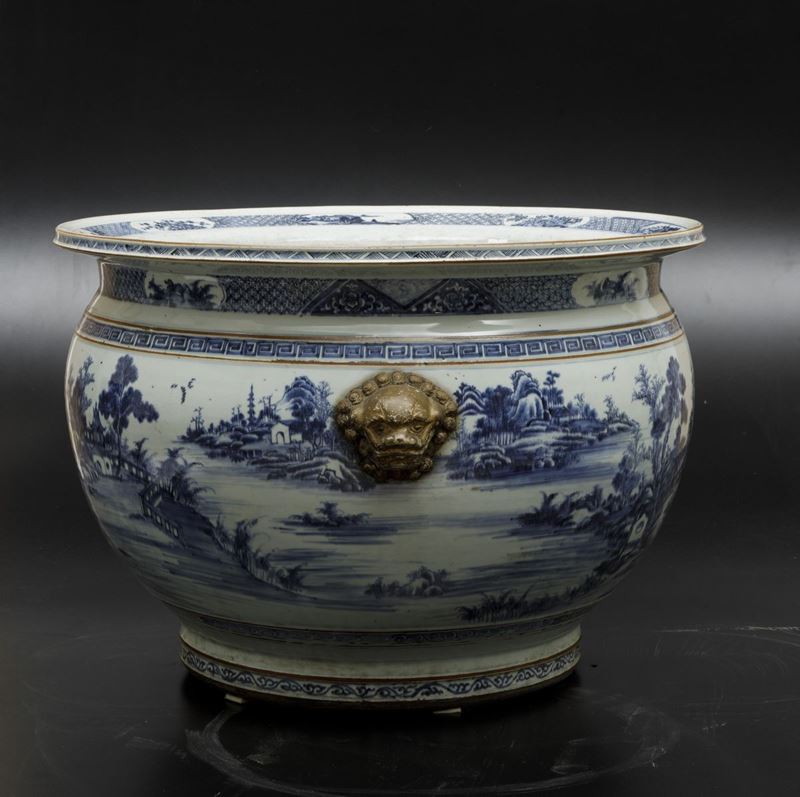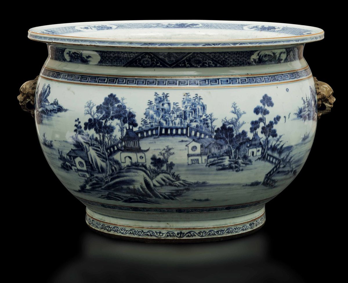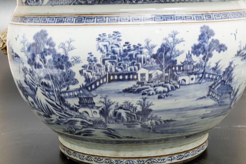 An important pair of cachepots in white and blue porcelain with landscapes and lion head-shaped mascarons, Qianlong period (1736-1796). 41x59cm