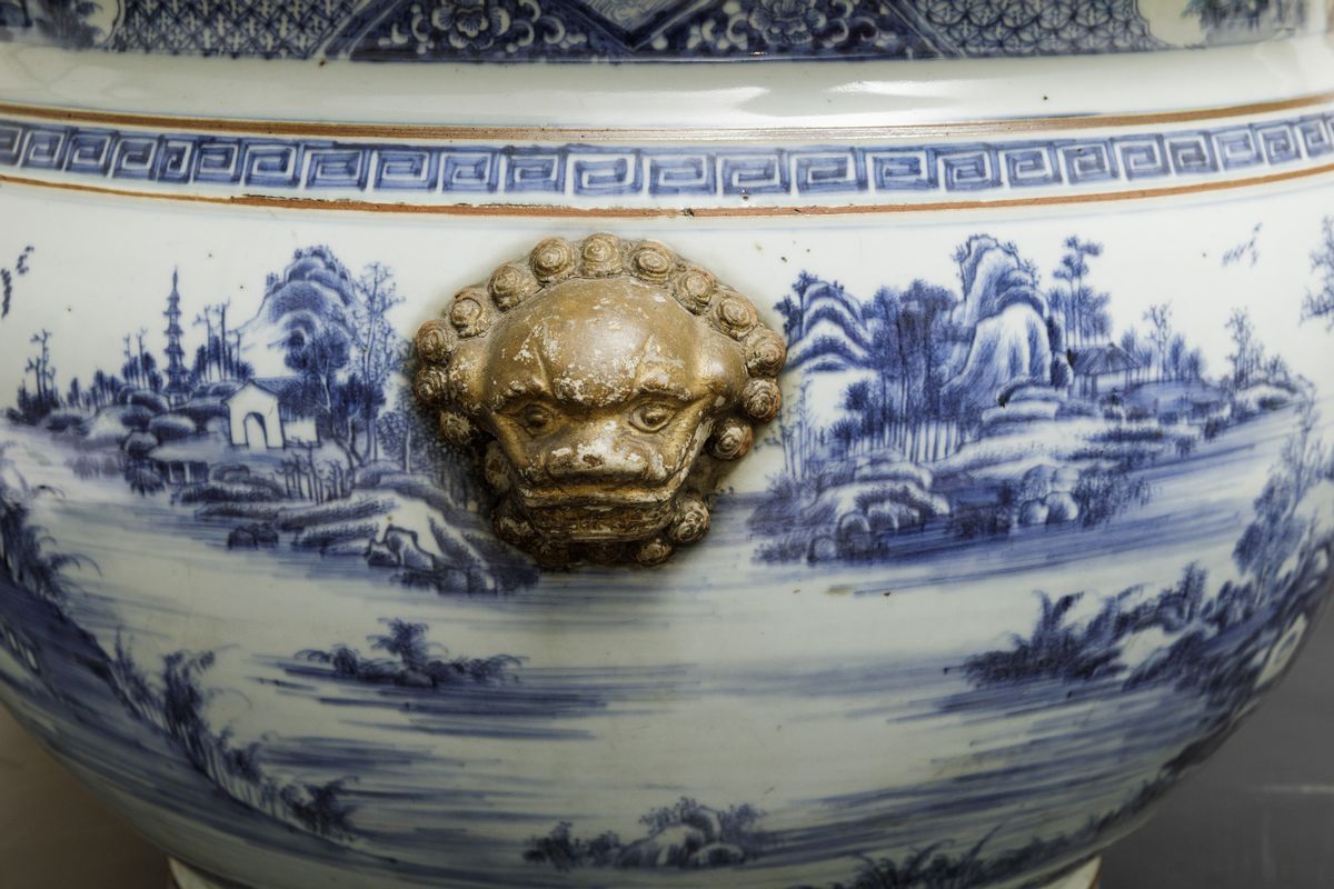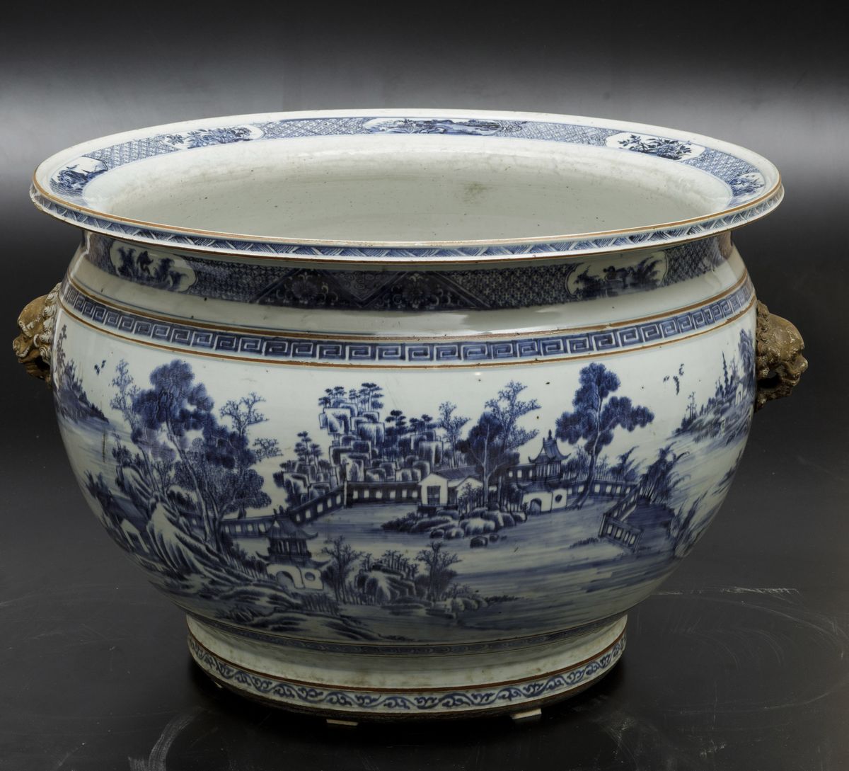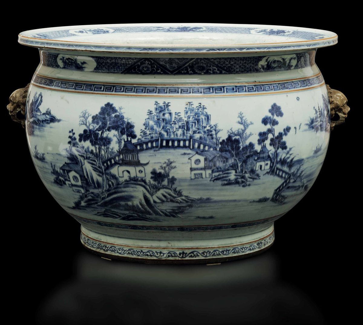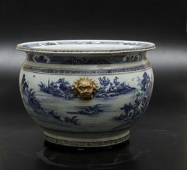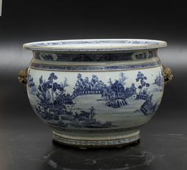 An important pair of cachepots in white and blue porcelain with landscapes and lion head-shaped mascarons, Qianlong period (1736-1796). 41x59cm