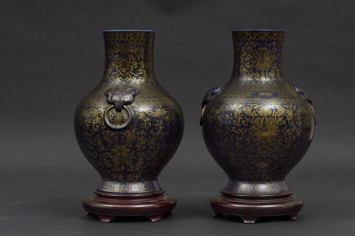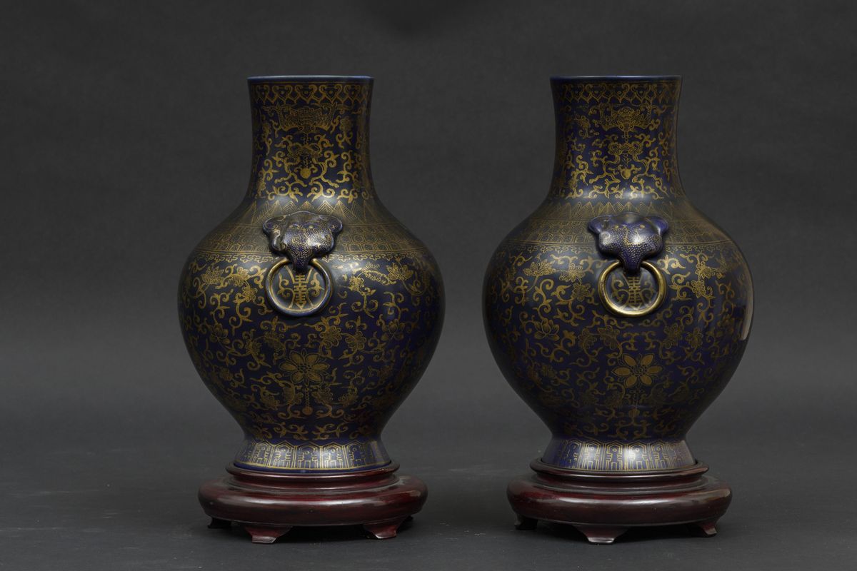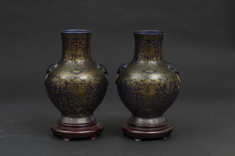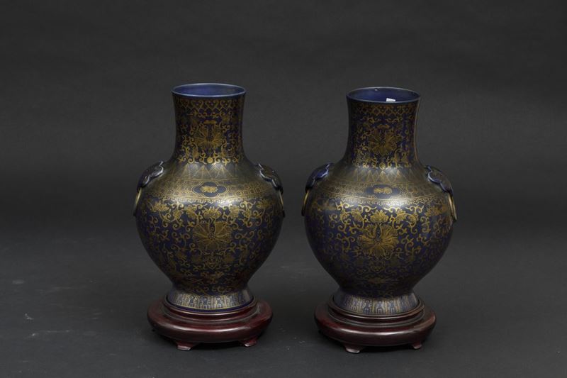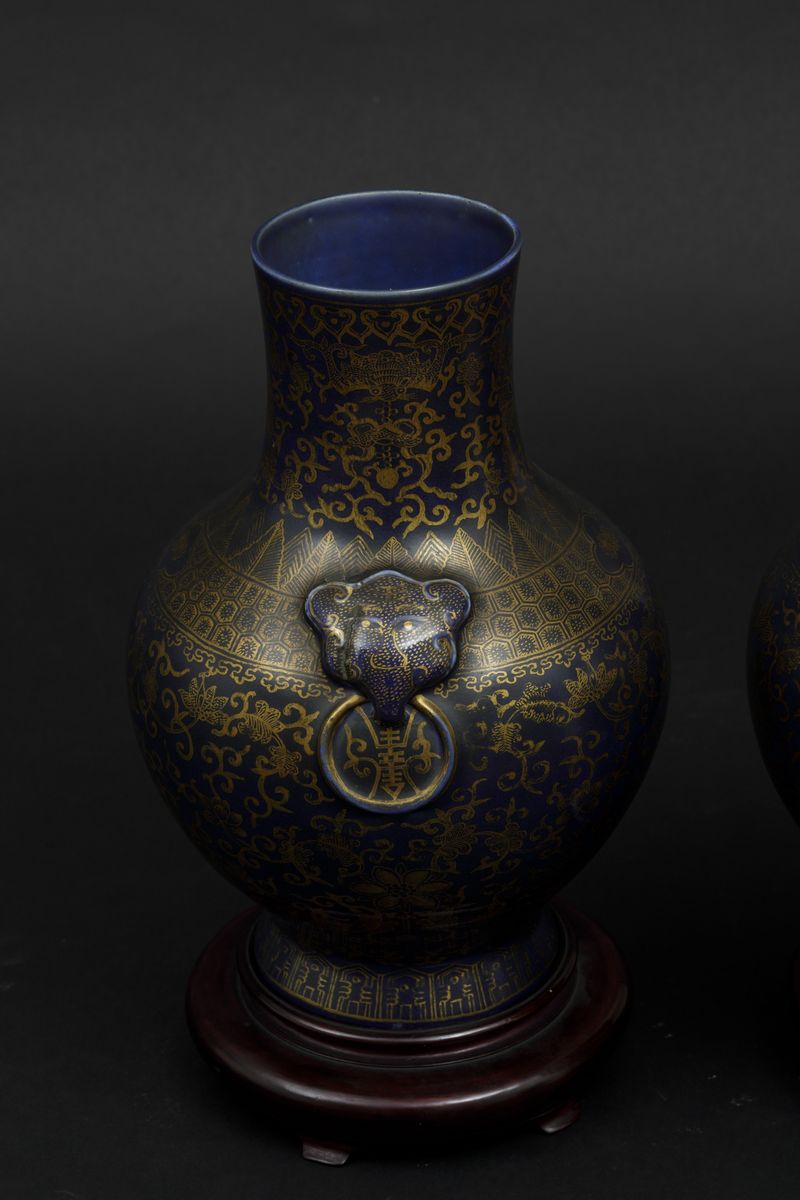 A pair of porcelain vases with flower decoration with golden highlights on blue background and mascarons. Qianlong apocryphal mark. H 29.5cm