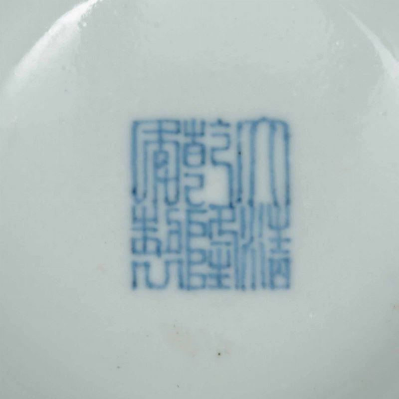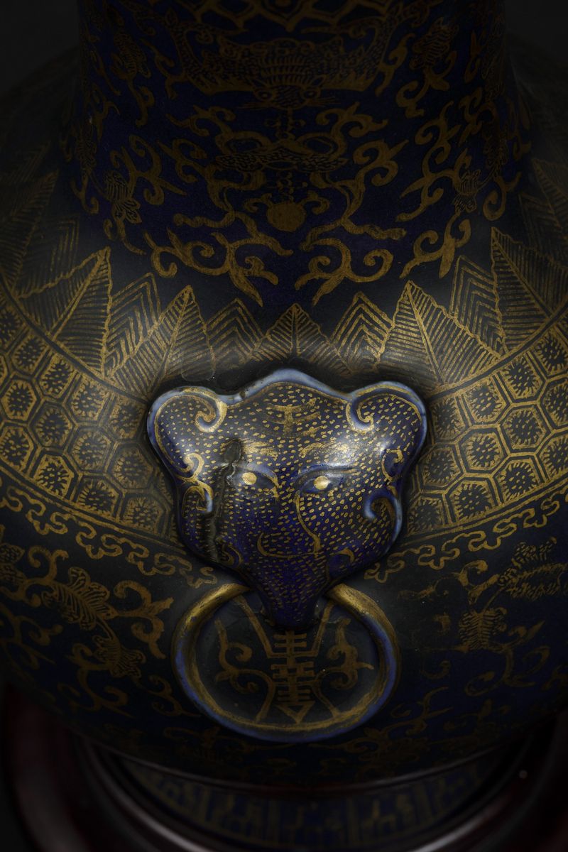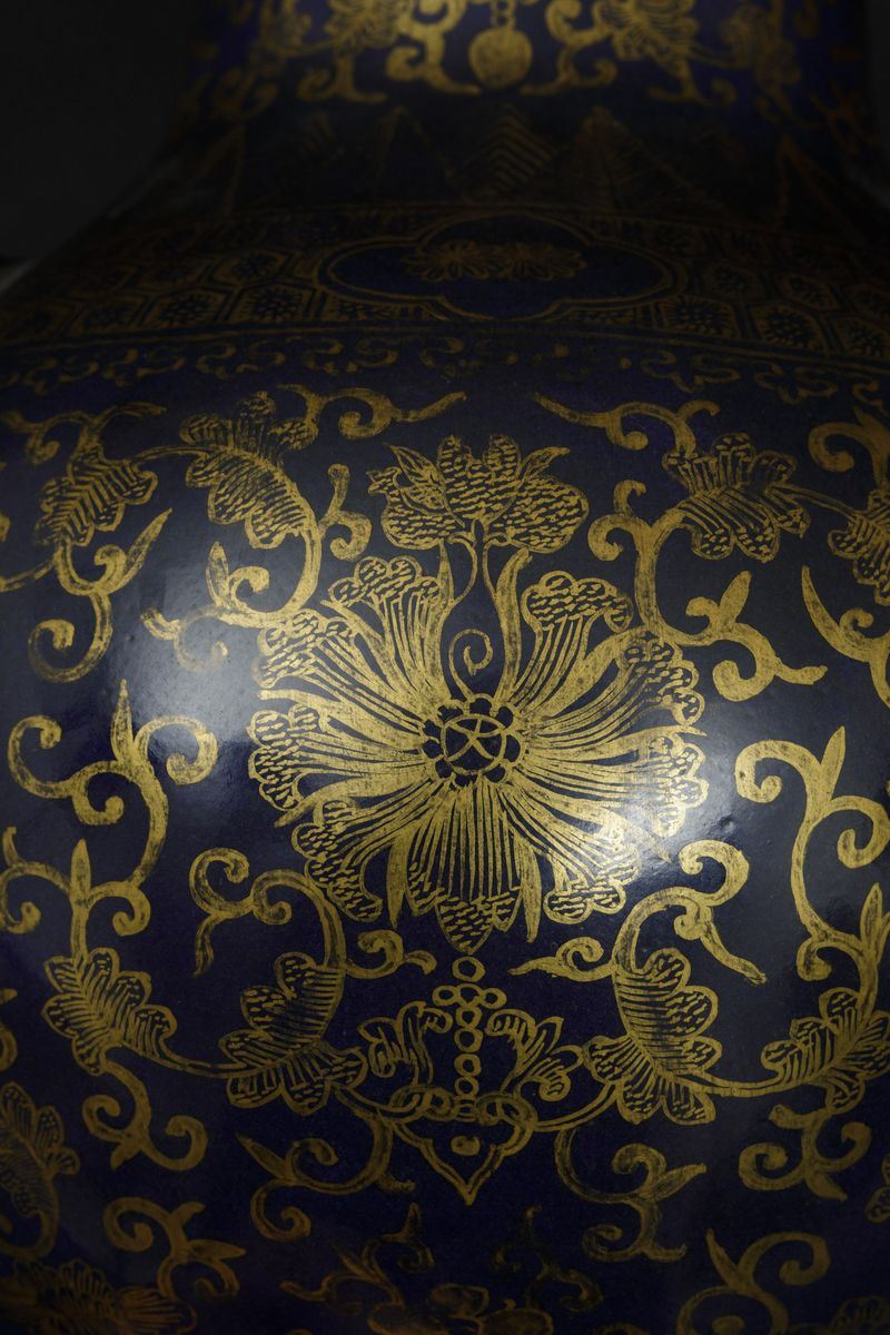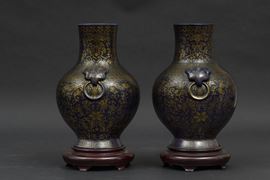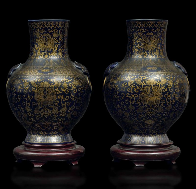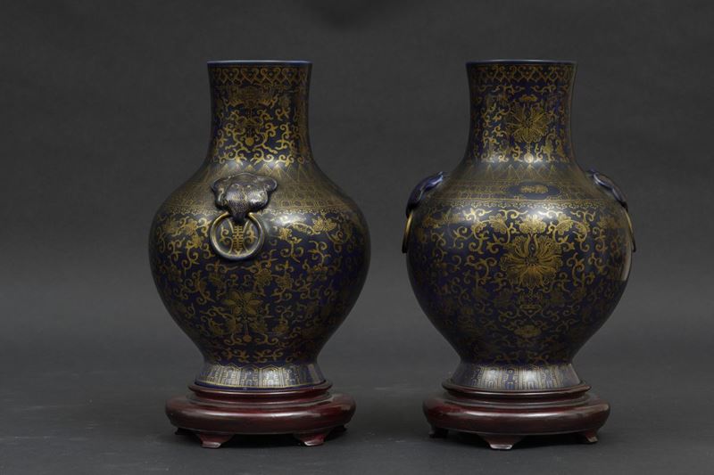 A pair of porcelain vases with flower decoration with golden highlights on blue background and mascarons. Qianlong apocryphal mark. H 29.5cm