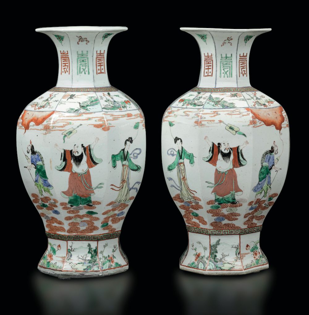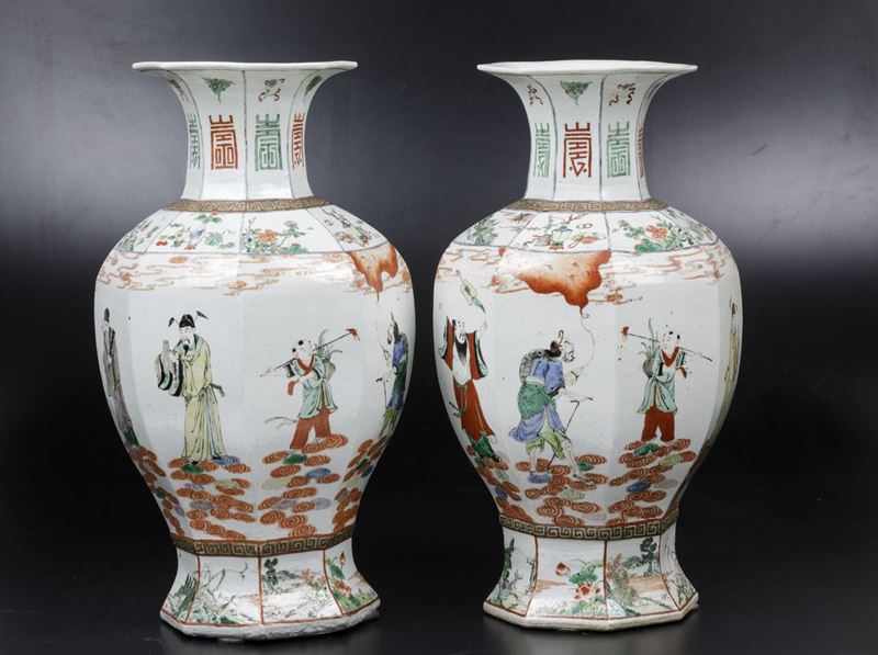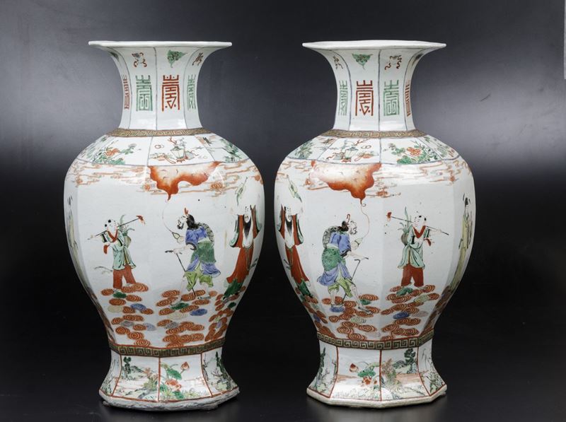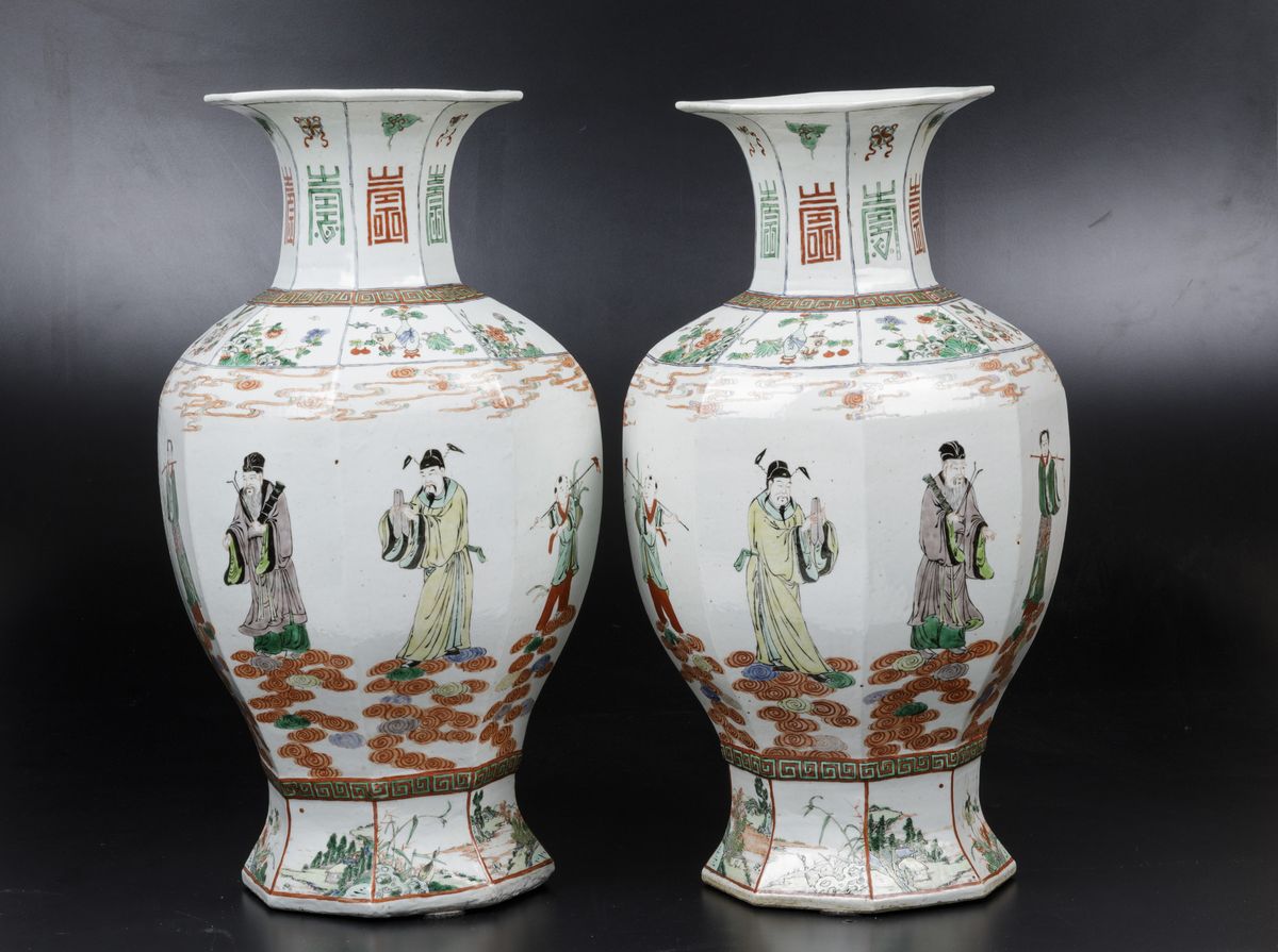 A pair of vases in porcelain of the Famille-Verte with polychrome enamels, figures of wisemen, symbols and naturalistic scenes, Guangxu period (1875-1908). H 51.5cm