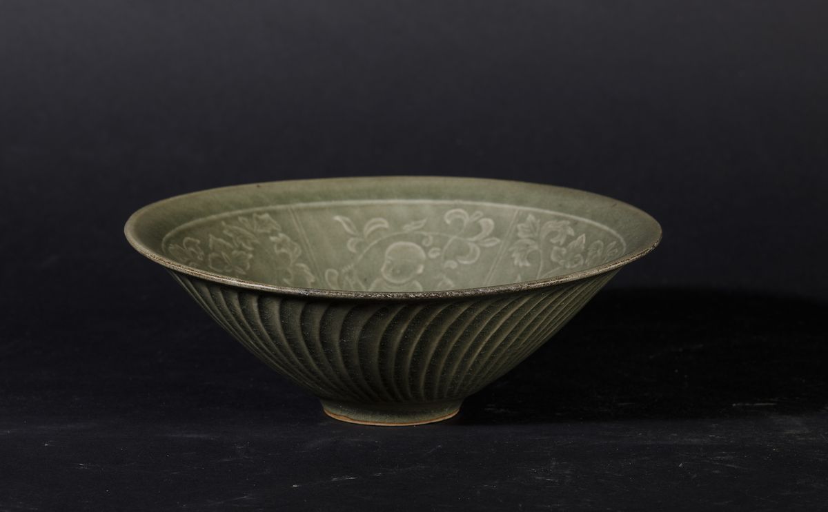 A Longquan Celadon porcelain bowl with green enamel, with flower raceme decorations and figures of children. 6.5x19cm