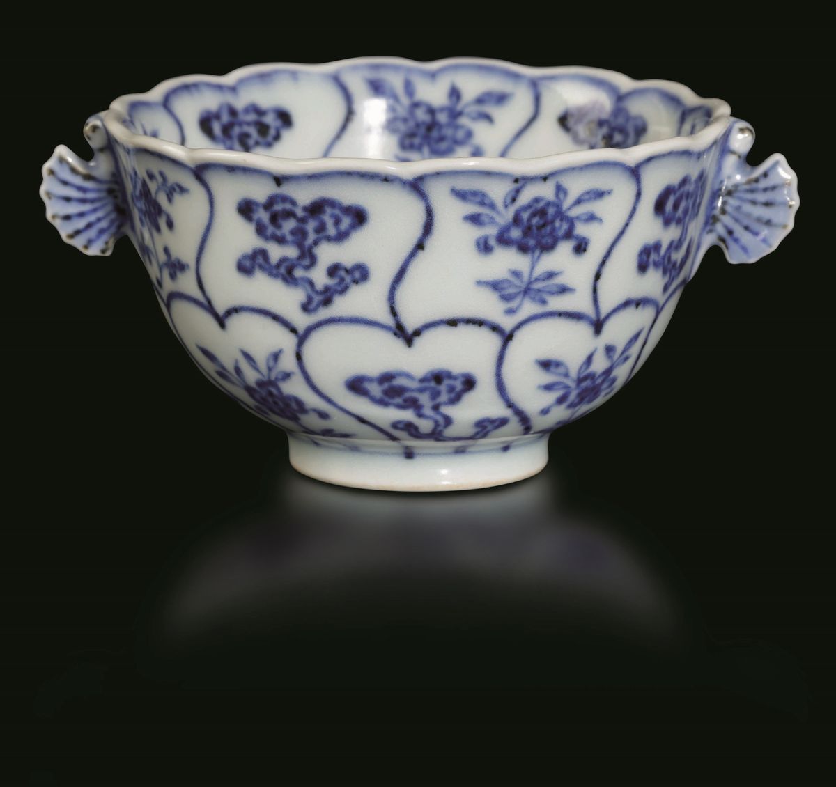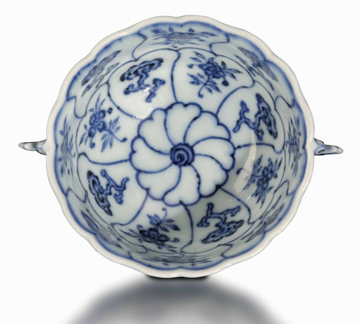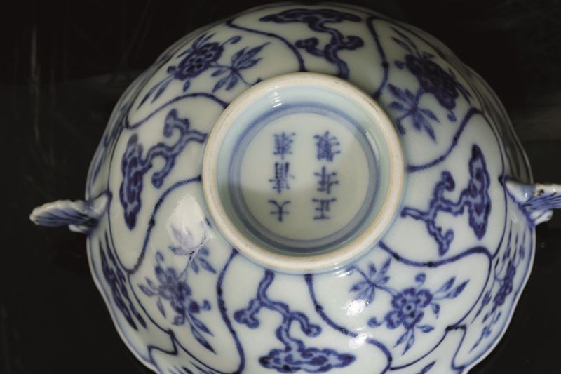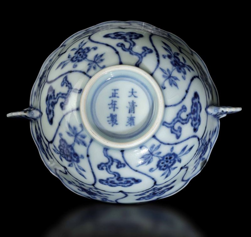 A rare bowl in white and blue porcelain, with molded butterfly handles and flower and lingzhi decorations, with mark and of the Yongzheng period (1723-1735). 13x6cm
