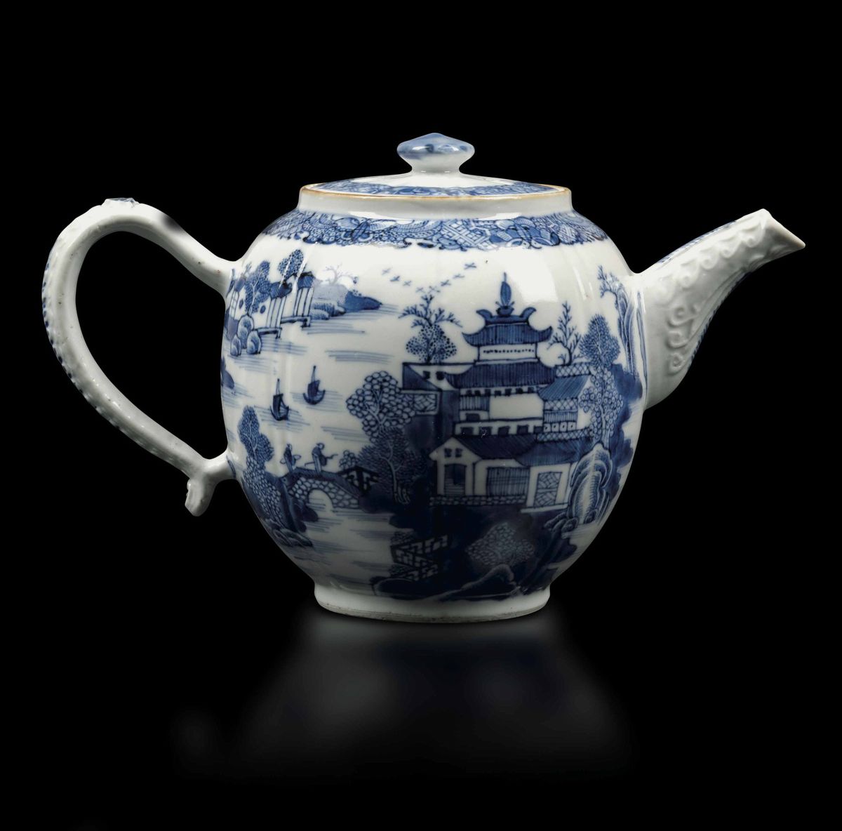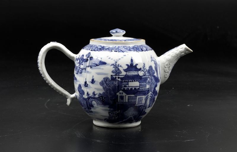 A teapot in white and blue porcelain depicting a landscape, Qianlong period (1736-1796). H 22.5cm