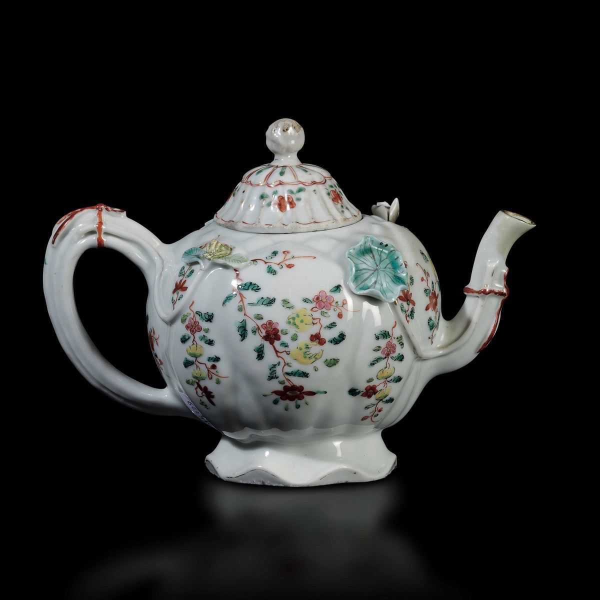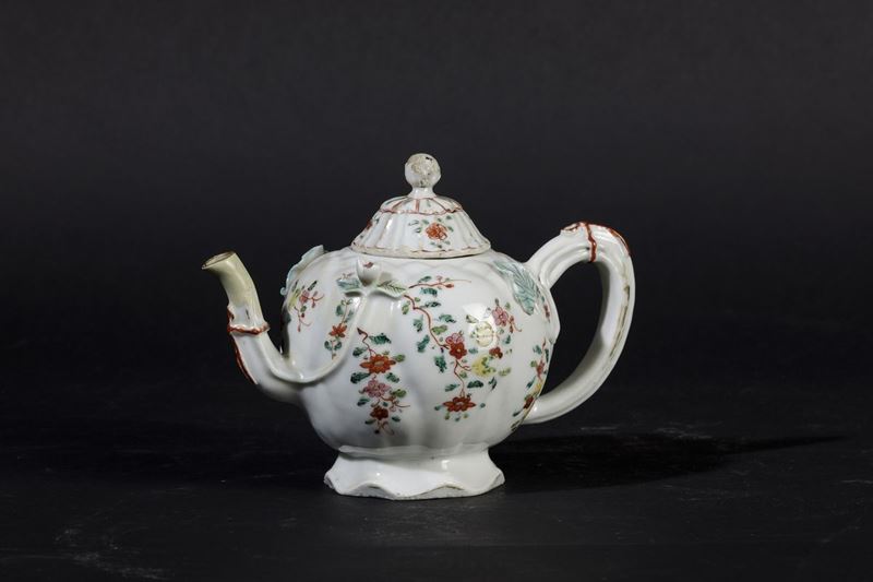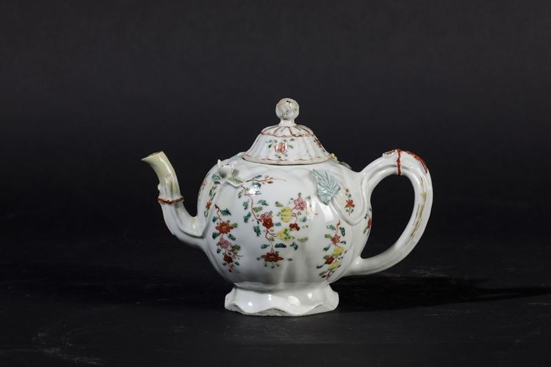 A teapot made of polychrome porcelain with flower decorations, details in relief and handle with a blossom shape, Qianlong period (1736-1796). H 14cm.