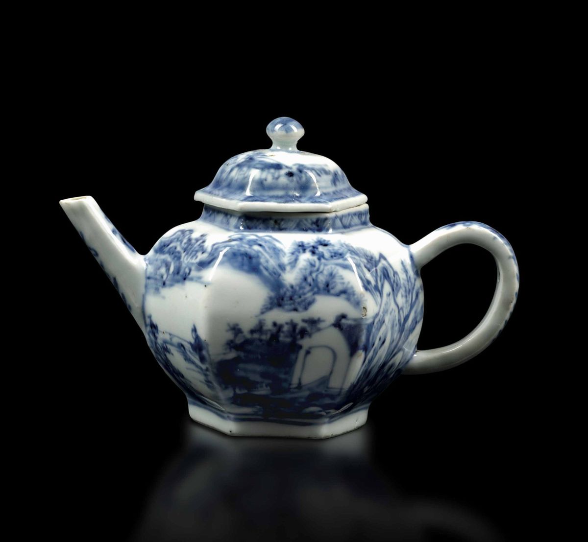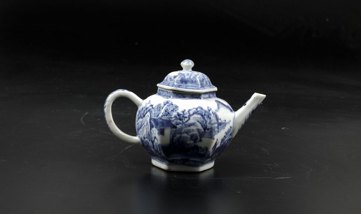 An hexagonal teapot in white and blue porcelain with landscape, Kangxi period (1662-1722). H 15.5cm