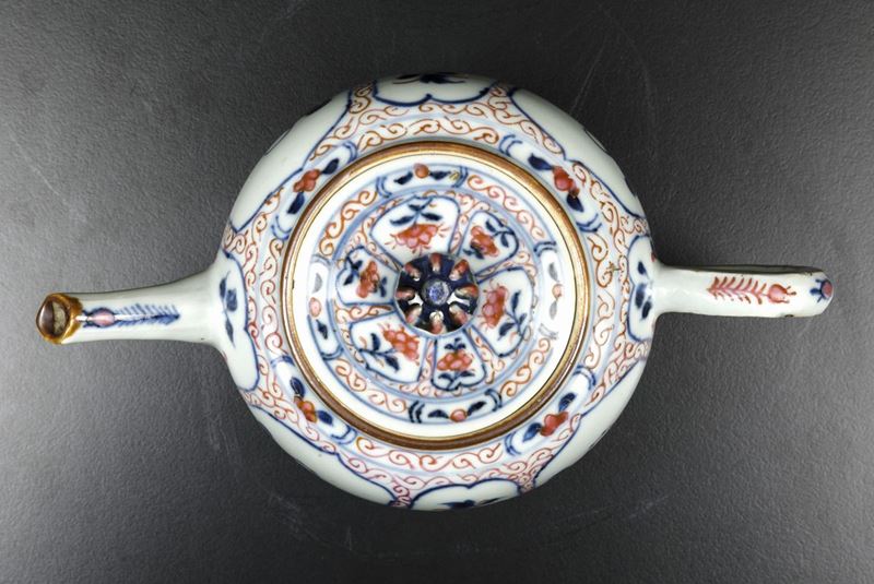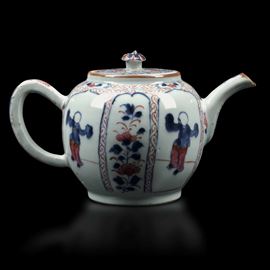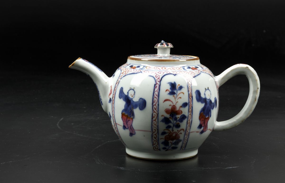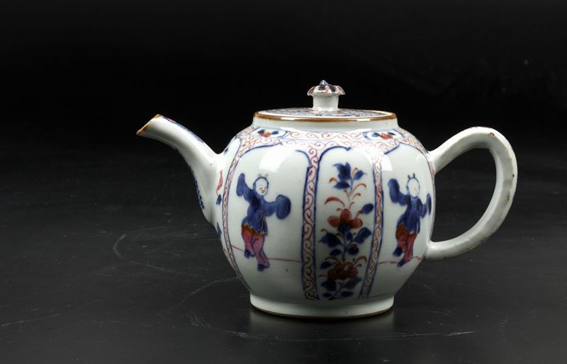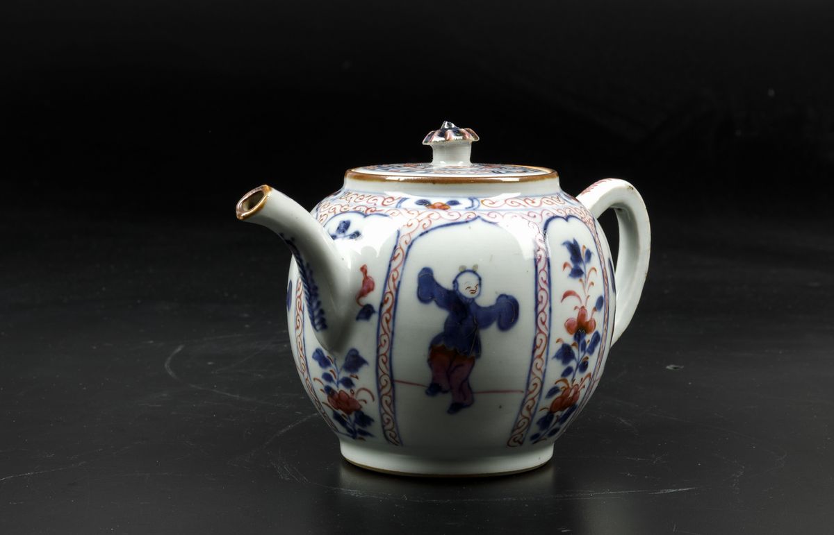 A teapot in Imari porcelain with flower decorations and figures of dancing children, Qianlong period (1736-1796). H 22cm