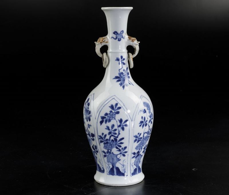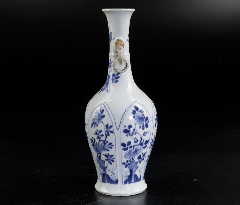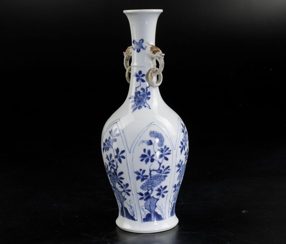 A vase in white and blue porcelain with flower decorations and ring-shaped handles, Kangxi period (1662-1722). H 28cm