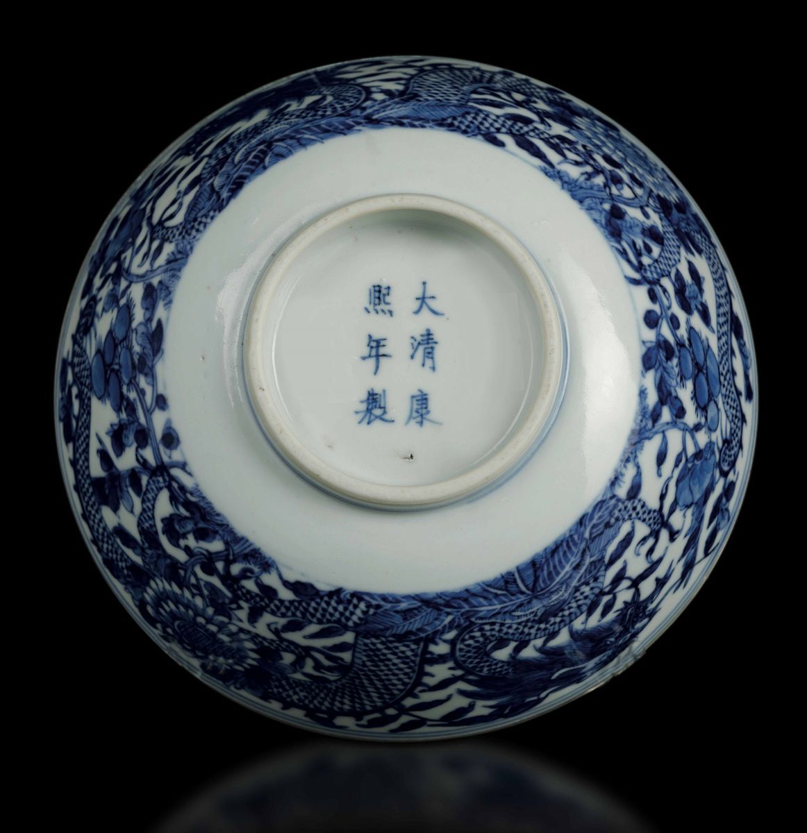 A white and blue porcelain vase with a dragon figure and branches in bloom. Kangxi apocryphal mark, 6.5x15.5cm