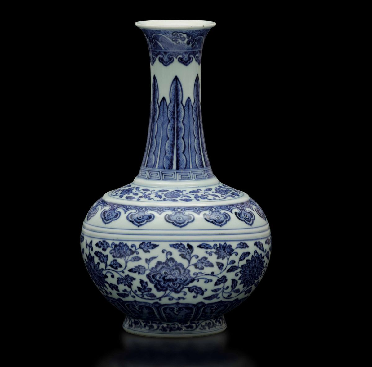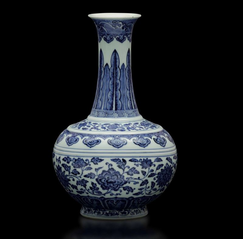 A rare bottle-shaped vase in white and blue porcelain with Ming style flower decoration, with mark and from the Qianlong period (1736-1796). H 38cm
