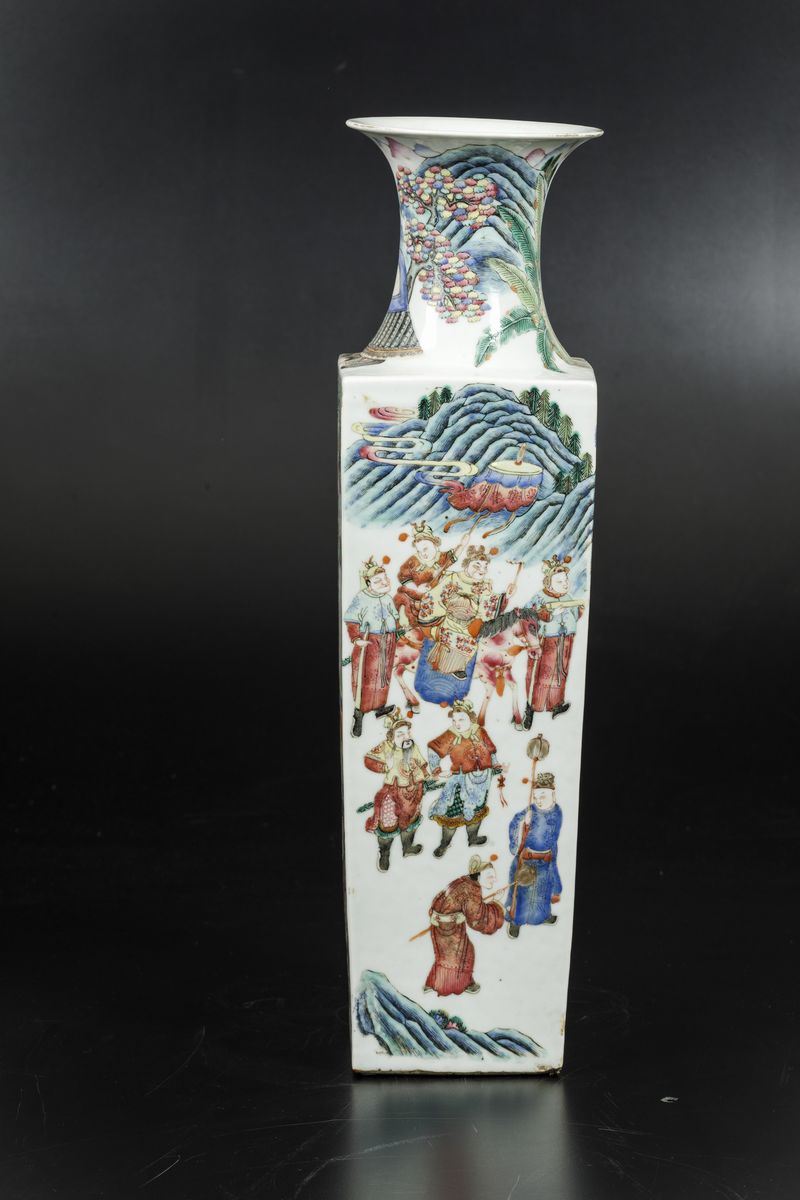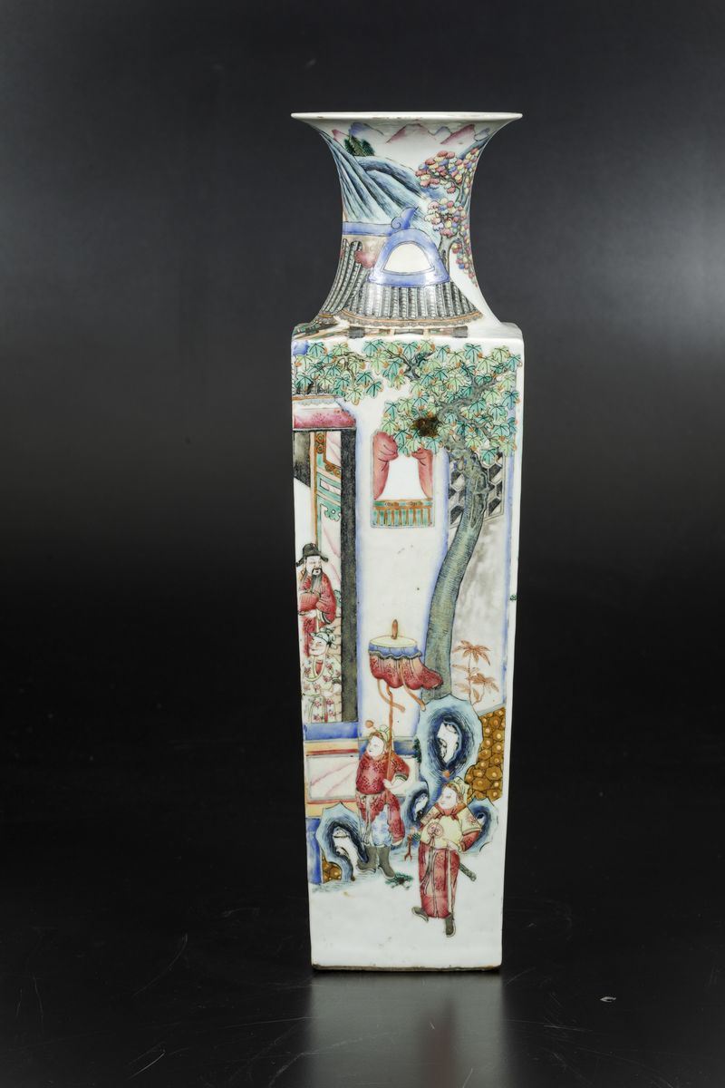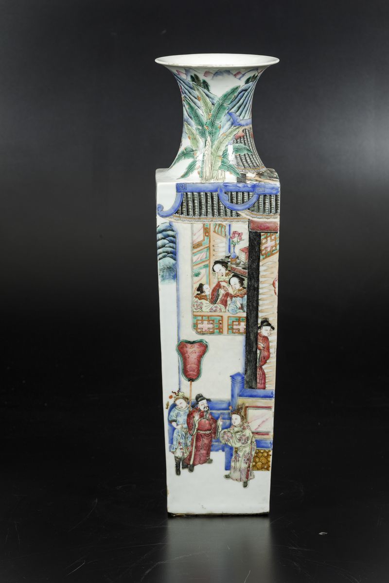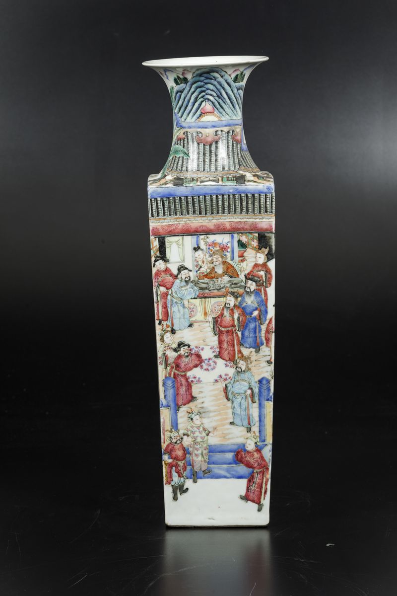 A vase with a square section in porcelain of the Famille-Rose with scenes from life at court, Guangxu period (1875-1908). H 50cm