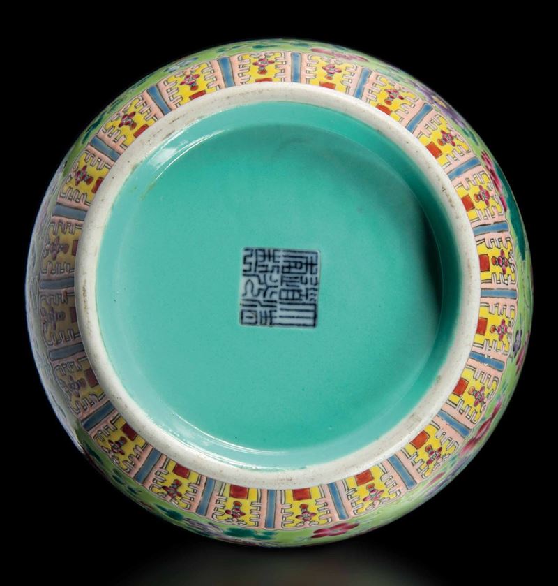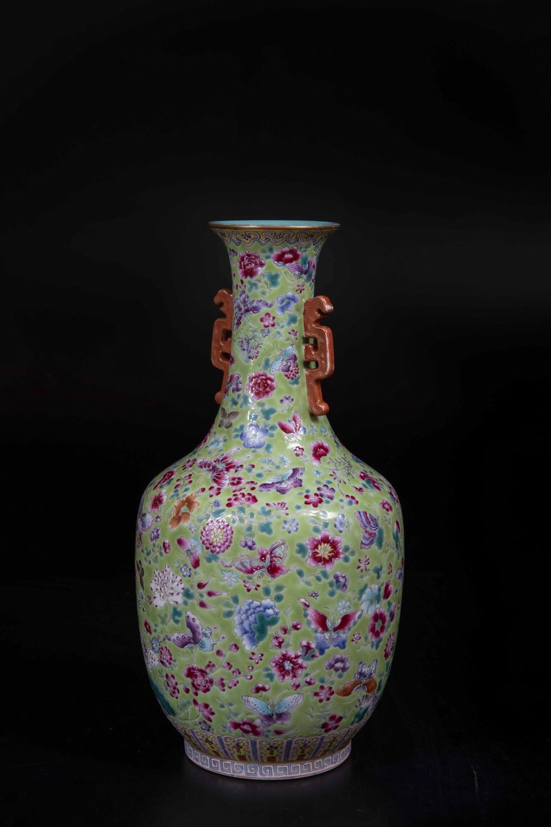 A porcelain vase with polychrome enamels, double handle with flower decoration on a green background, probably with mark and Daoguang period (1821-1850). H 32cm