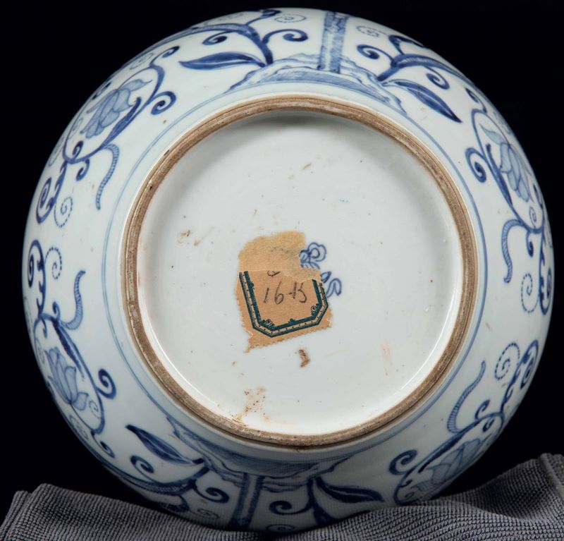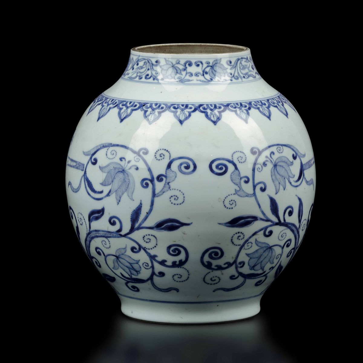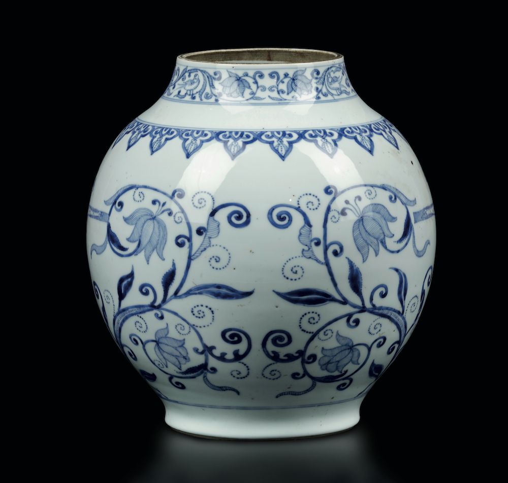 An extremely rare vase in white and blue export porcelain with flower decorations and religious subjects, Kangxi period (1662-1722). H 23cm