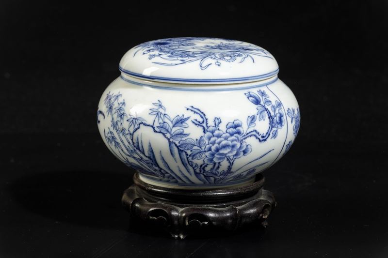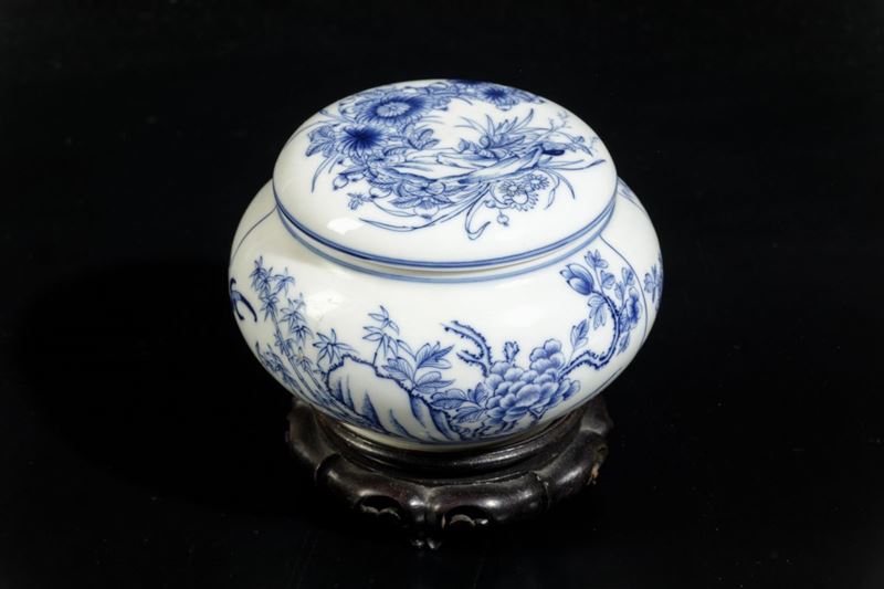 A container in white and blue porcelain with naturalistic scenes and flower decorations, 1800s. 13x18cm