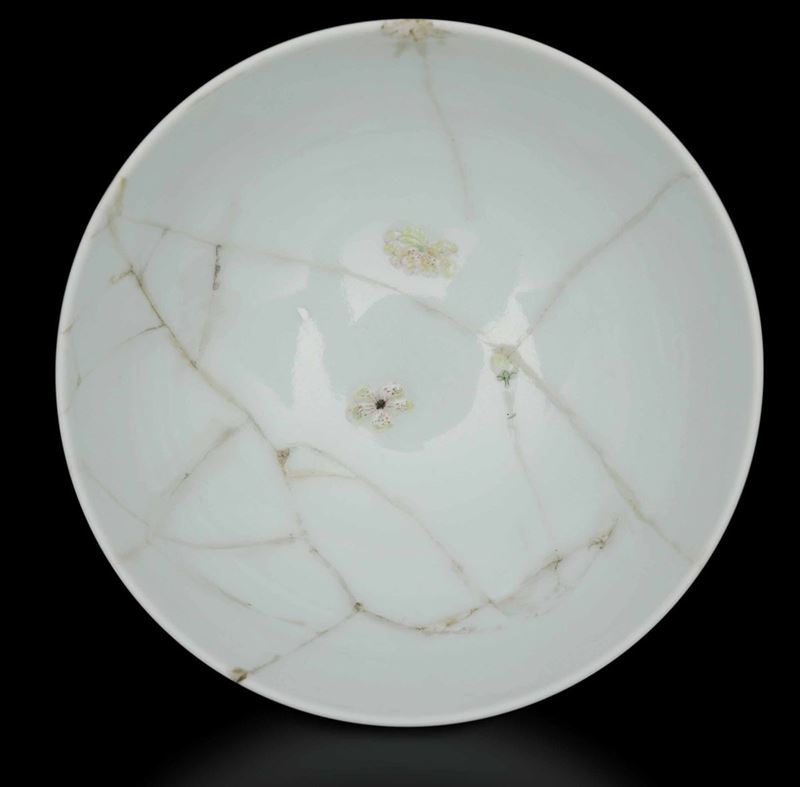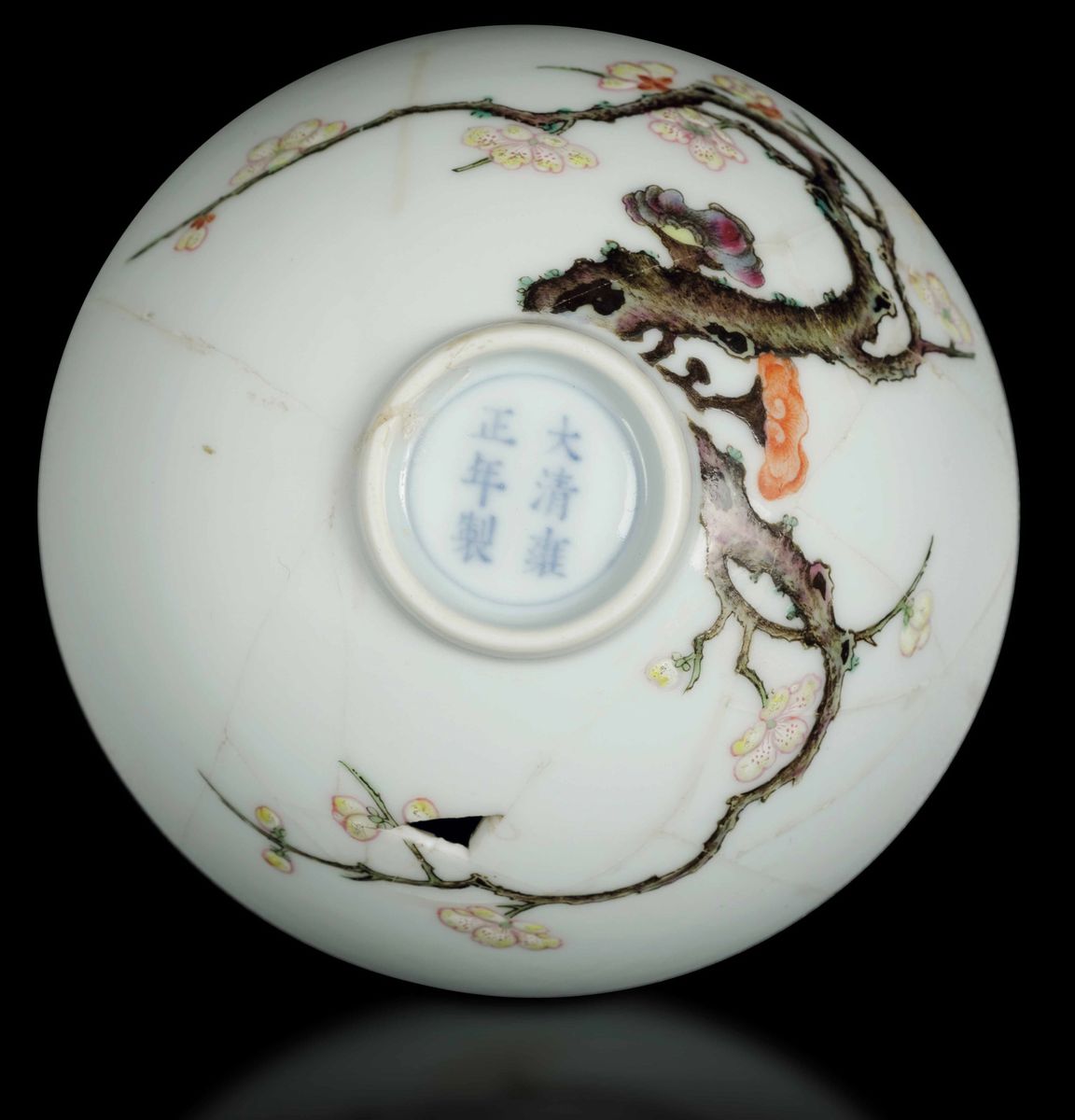 A small porcelain bowl attributed to Falangcai, finely decorated with blossoming peach tree branch, with mark and of the Yongzheng period (1723-1735). 4x9cm