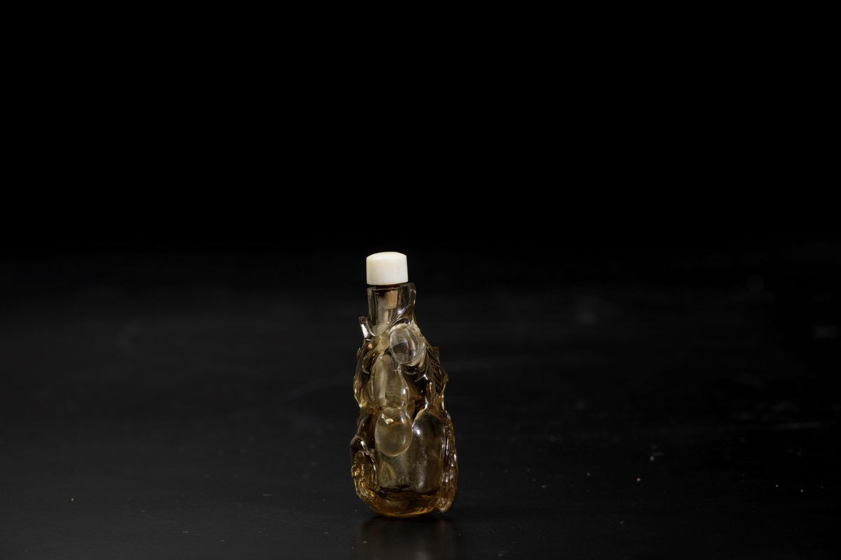 A snuff bottle carved in rock crystal with figures of monkeys and plant elements in relief. H 6.6cm