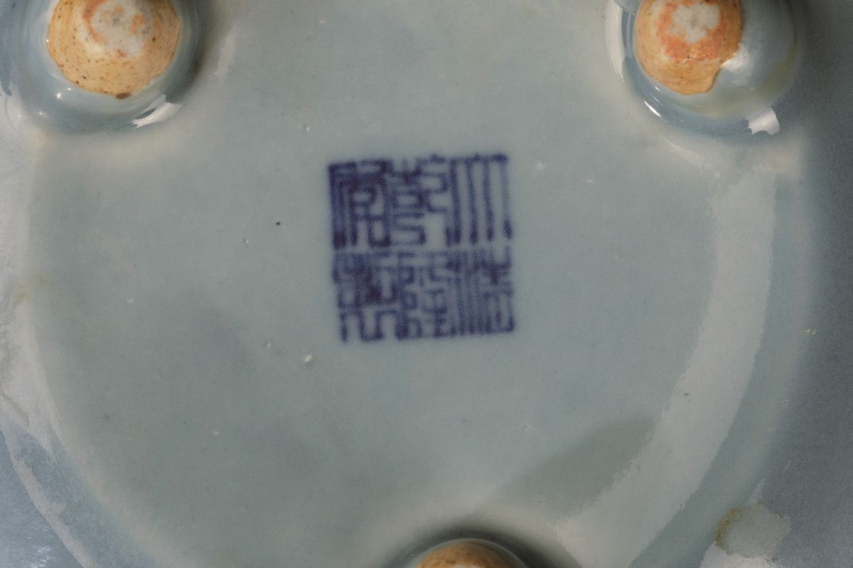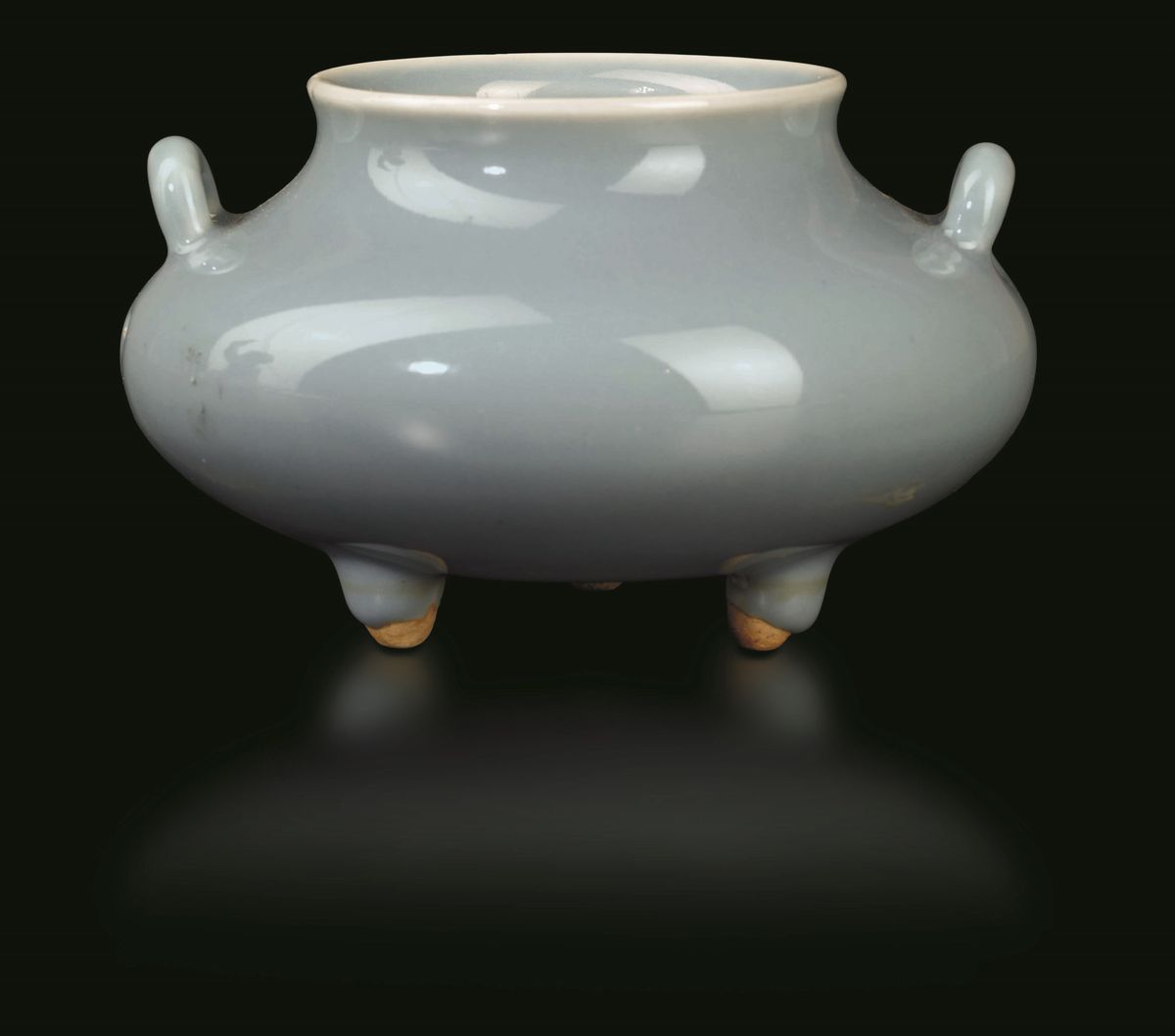 A double handle censer in Clair de Lune porcelain. Qianlong apocryphal mark. 9.5x16cm