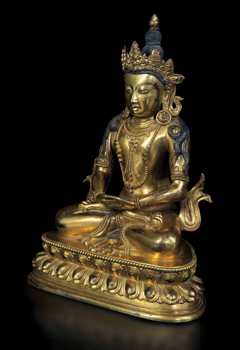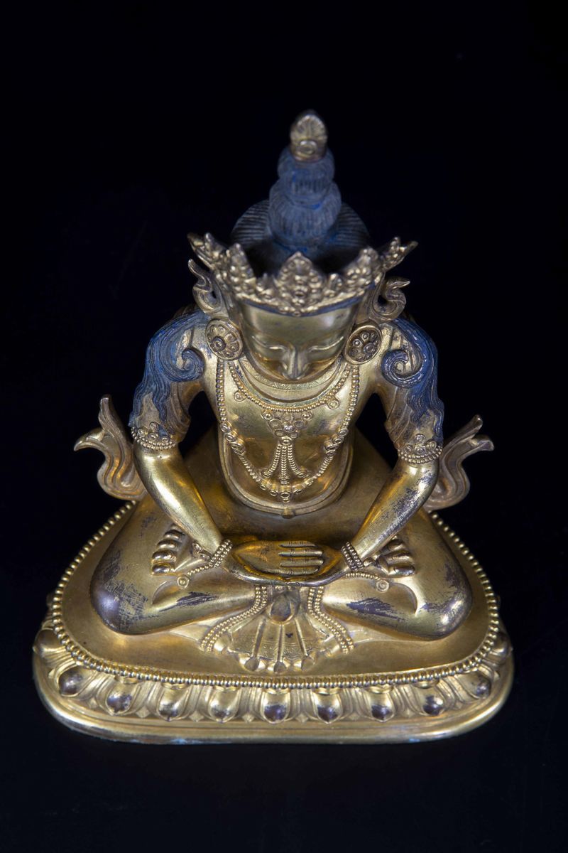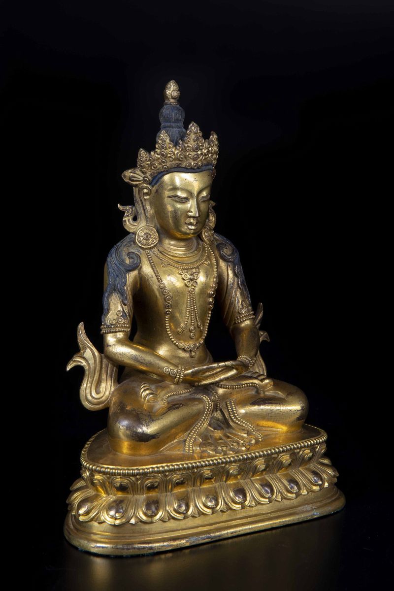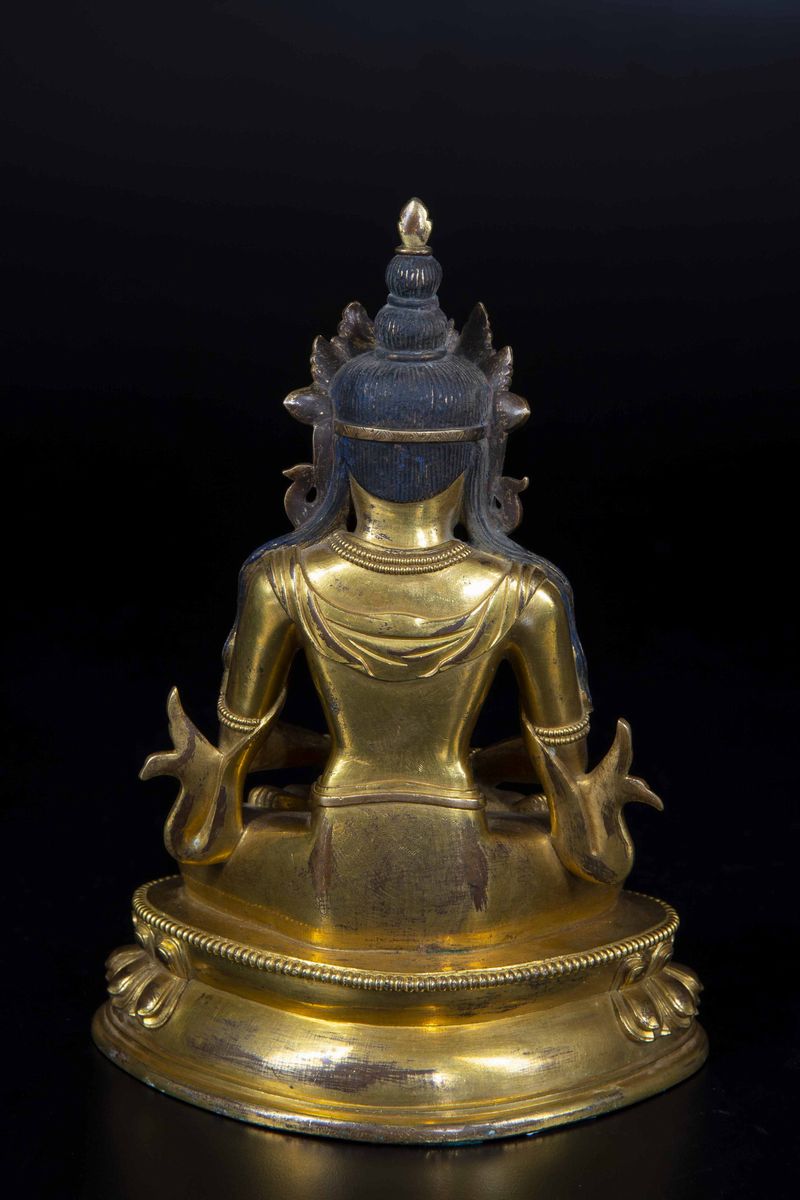 A figure of Amitayus Buddha seated on double lotus flower in gilded bronze with traces of polychromy. H 22.5cm