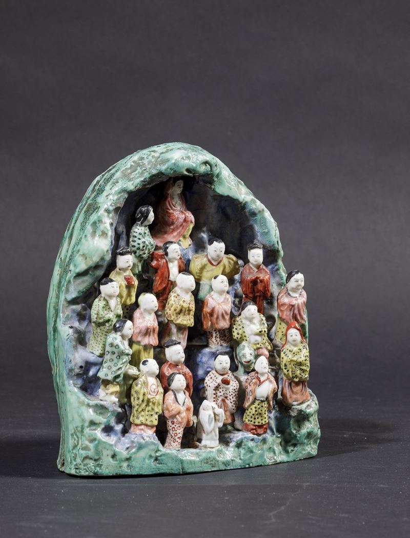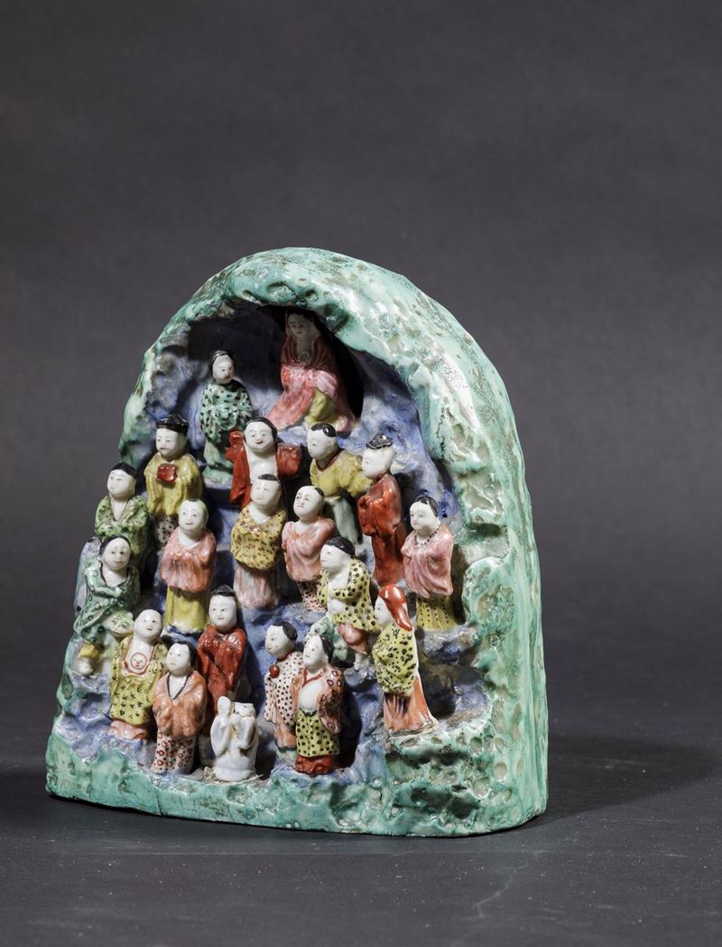 Made in polychromatic porcelain depicting Guanyin with disciples, Jiaqing period (1796-1820). H 22cm.