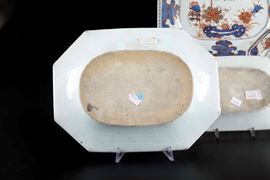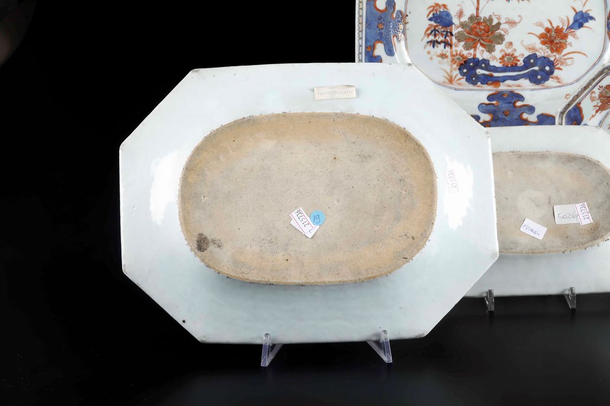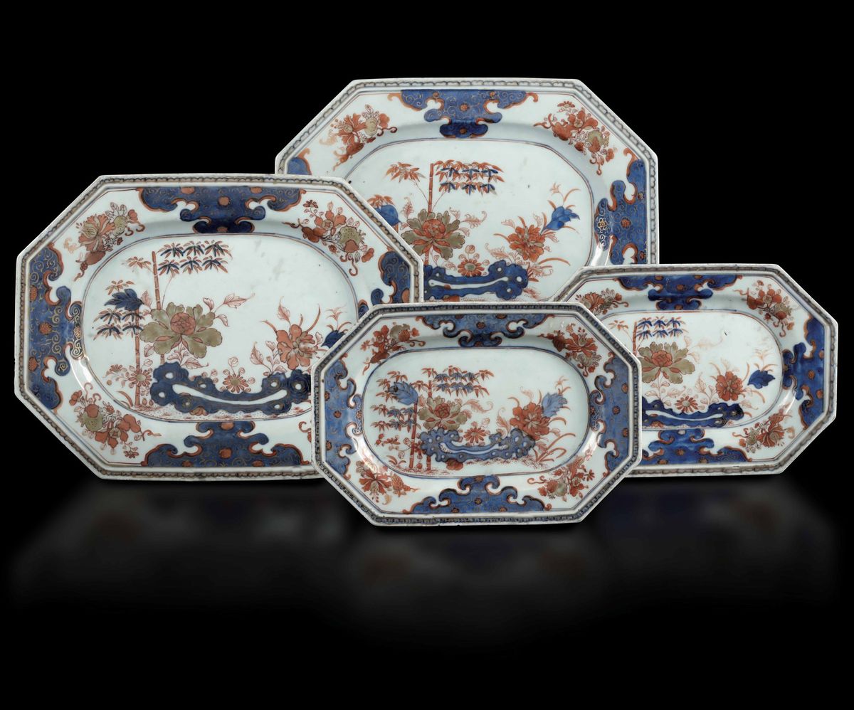 Two large and two small octagonal Imari porcelain plates with flower decorations, Qianlong period (1736-1796). 32x25cm; 25x17cm