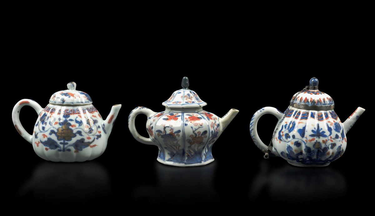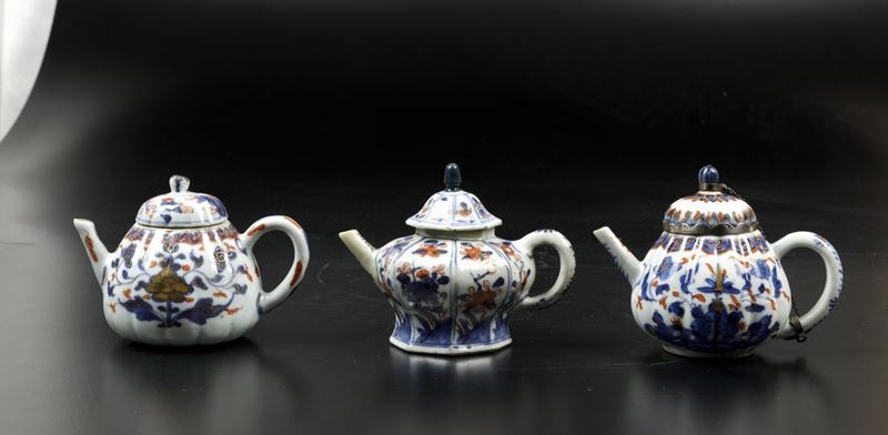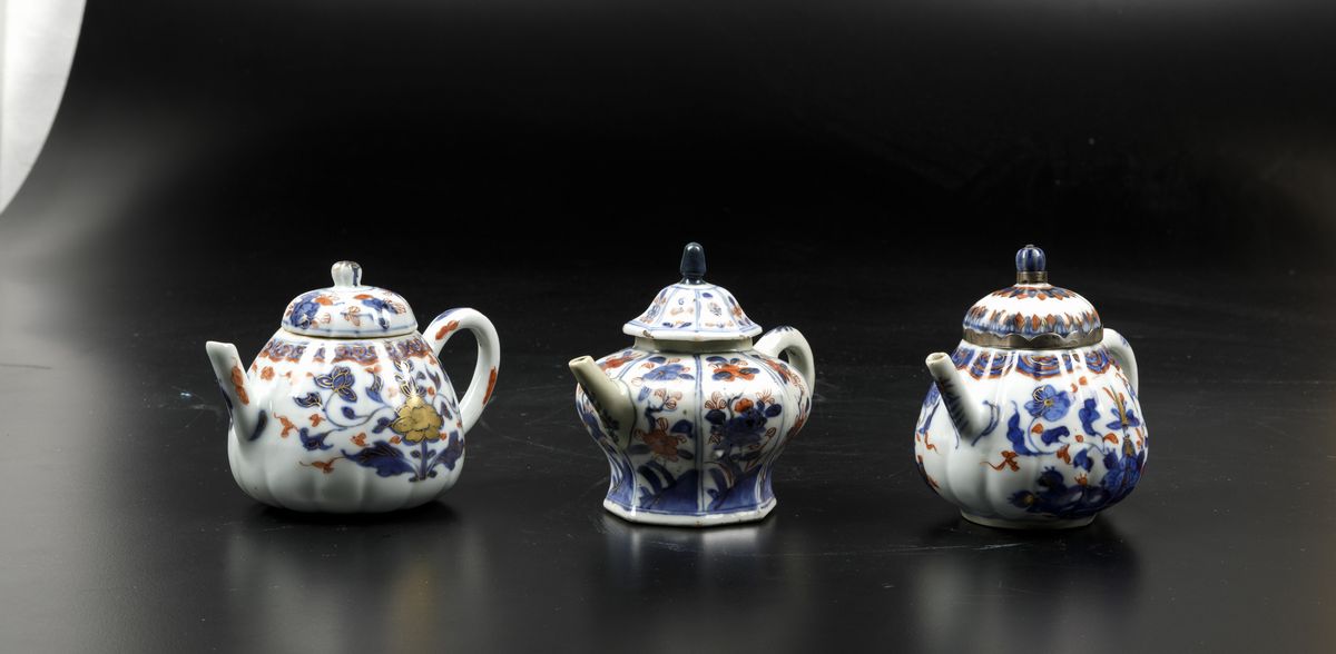 Three Imari porcelain teapots with flower decorations, Kangxi period (1662-1722). H from 13.5cm to 14cm