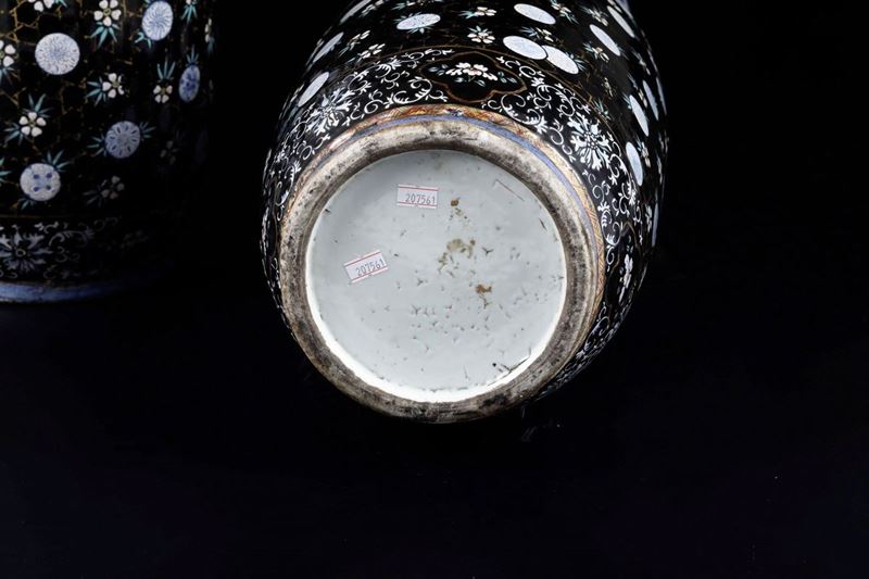 A pair of parcelain vases of the Famille-Noire with floral decorations and golden highlights. H 59cm