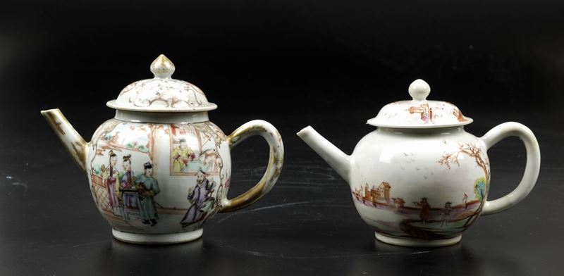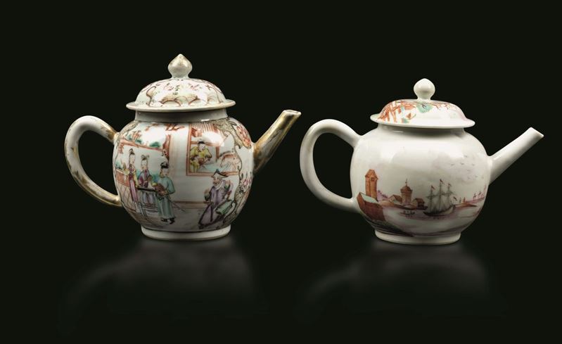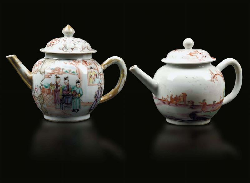 Two teapots from the Famille-Rose porcelain depicting scenes of everyday life and landscapes, Qianlong period (1736-1796). H 18.5cm