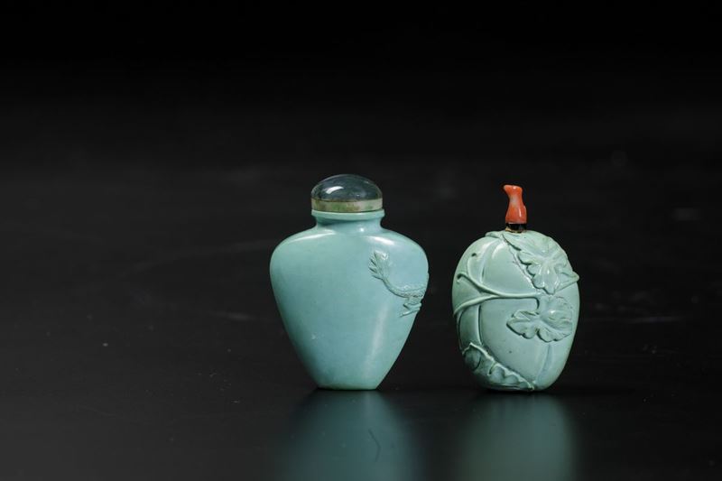 Two snuff bottles carved in turquoise with the figure of a dragon and plant motifs in relief. H 5.2 and 5.3cm