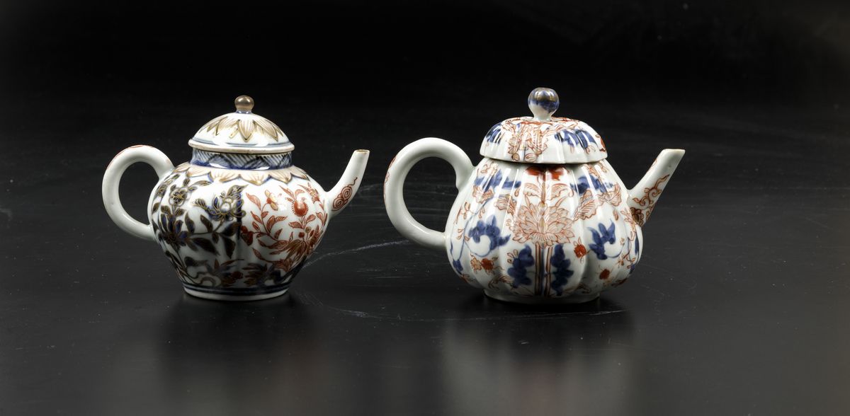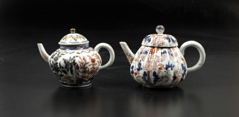 Two teapots in Imari porcelain with flower decorations from the Kangxi period (1662-1722). H 13.2cm and 14.8cm