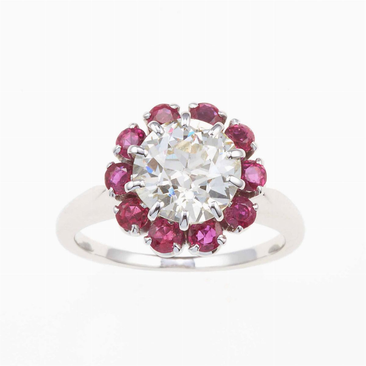 Old-cut diamond and ruby cluster ring