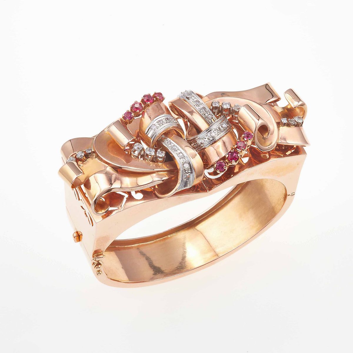 Bracciale rigido con diamanti di vecchio taglio e rubini sintetici