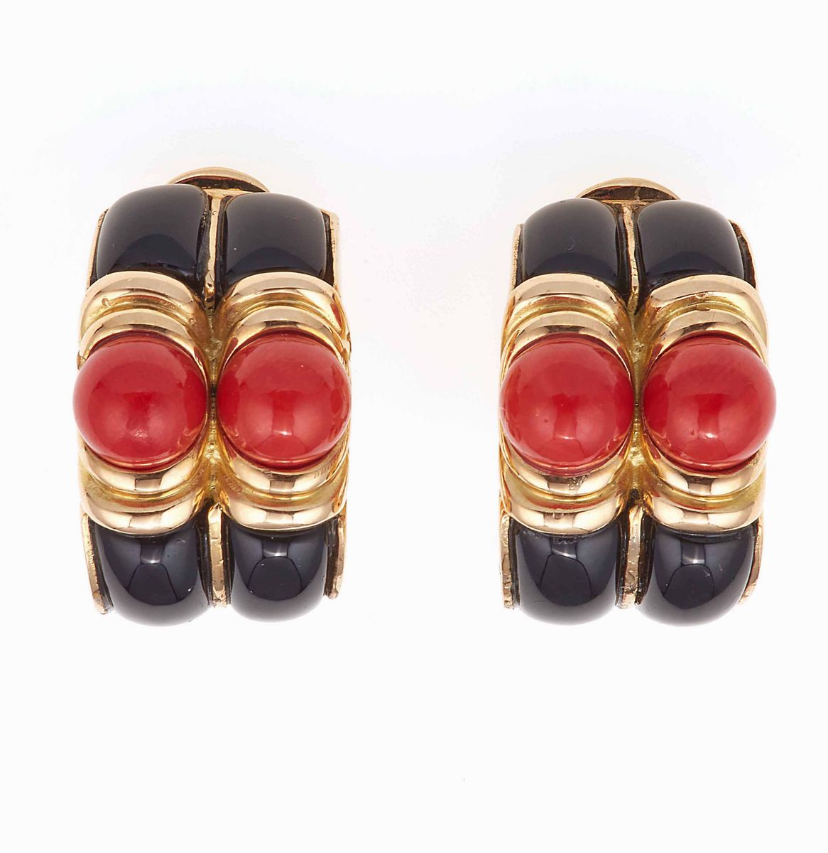 Pair of coral, onyx and gold earrings. Signed Bulgari