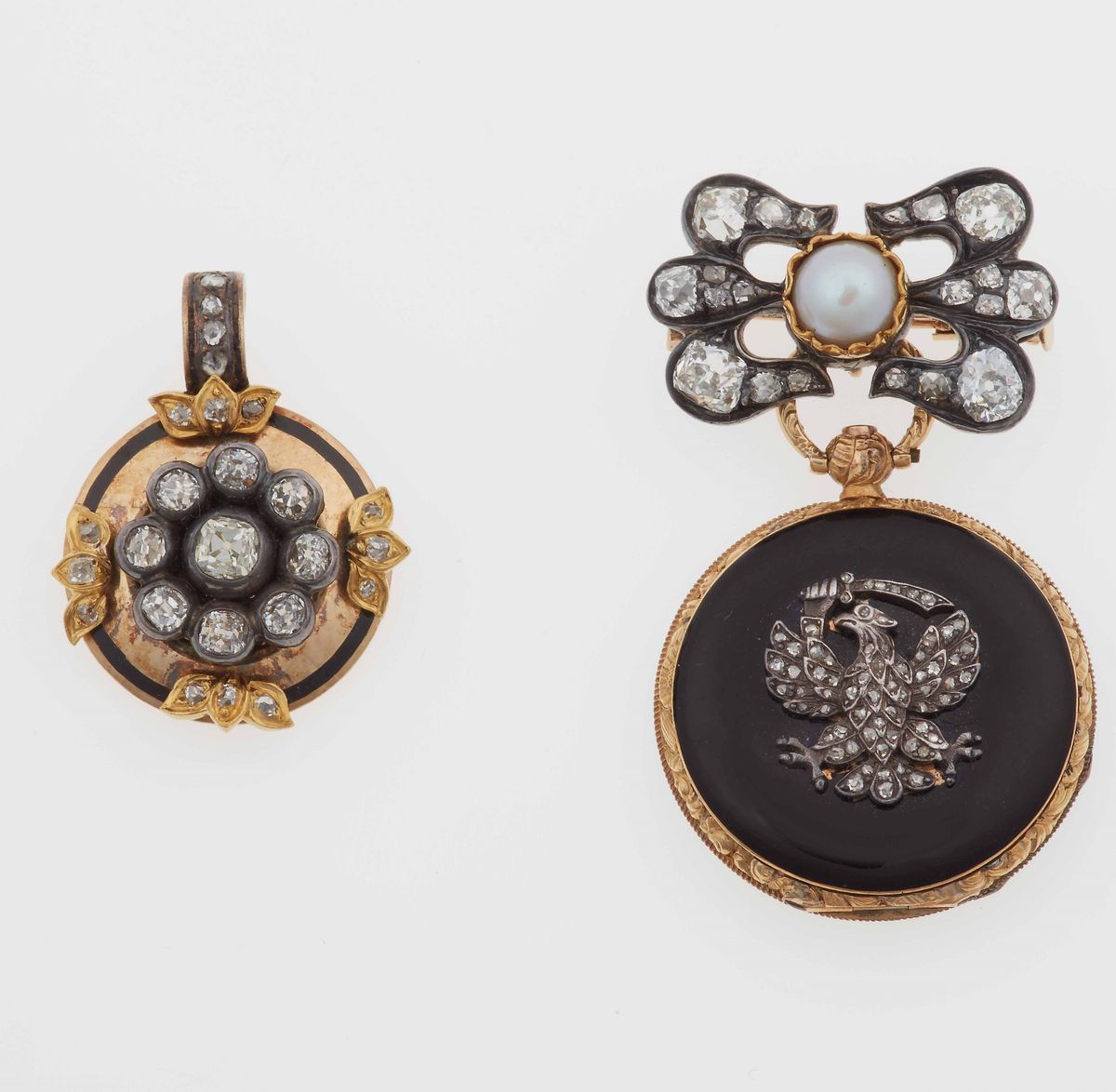 Lotto composto da un piccolo orologio da tasca con smalto e diamanti ed un pendente con smalto e diamanti