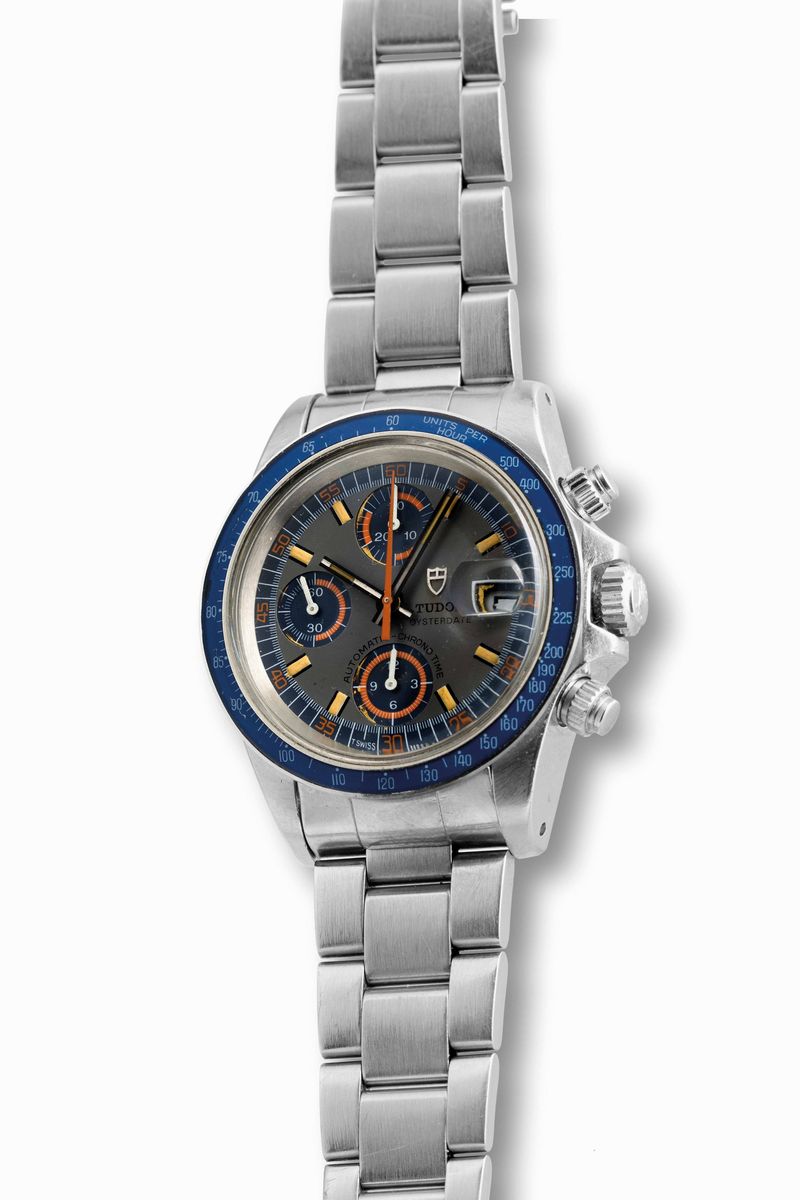 TUDOR - Raro Tudor Monte Carlo ref. 94200, Exotic Grey dial and blue Bakelite Bezel, acciaio, cronografo automatico, circa 1979