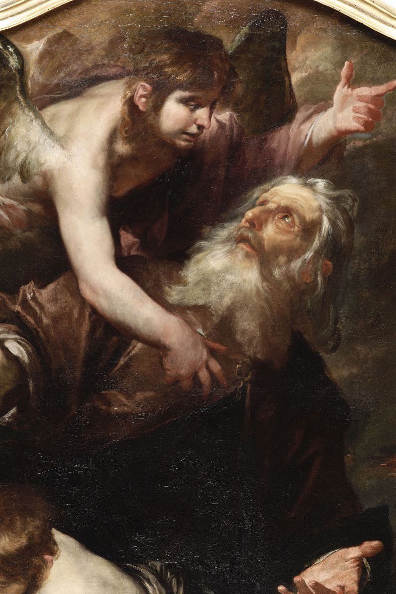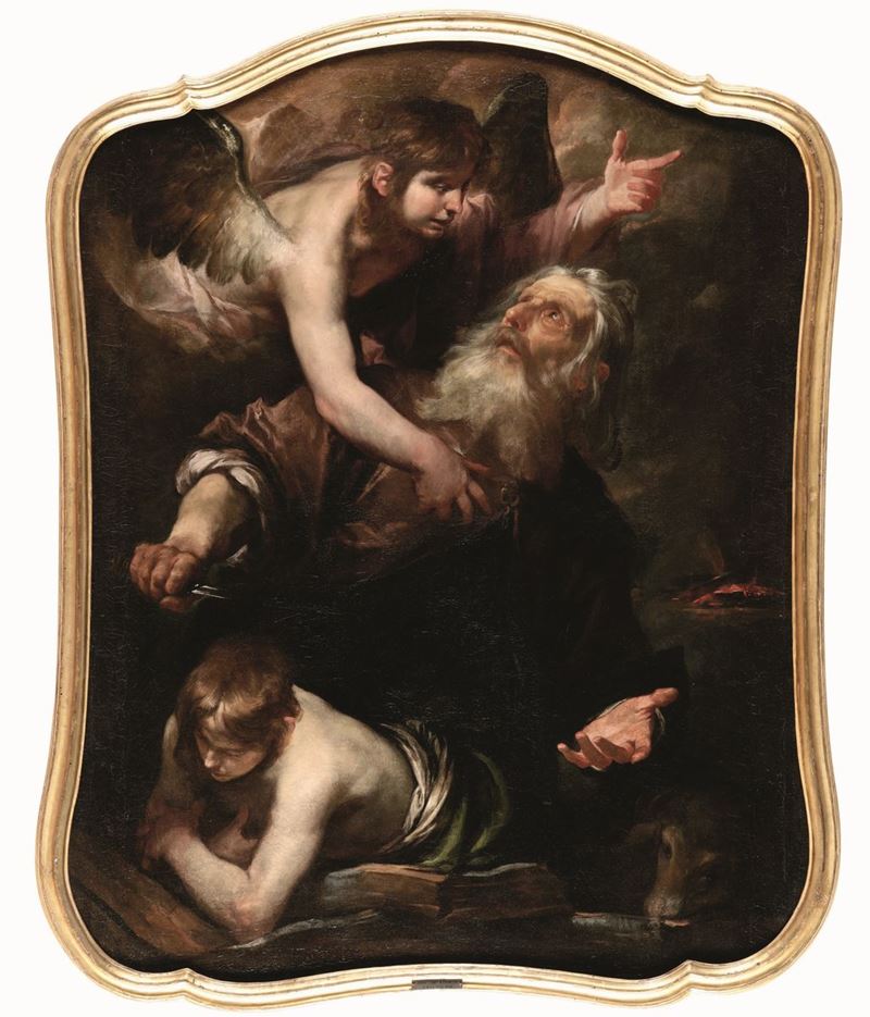 Esposizioni: Caravaggio e caravaggeschi. La pittura di realtà , Sassari, Palazzo Ducale (25 giugno - 30 ottobre 2015), mostra a cura di V. Sgarbi. Bibliografia: Caravaggio e caravaggeschi. La pittura di realtà , catalogo della mostra (Sassari, Palazzo Ducale, 25 giugno - 30 ottobre 2015), catalogo della mostra a cura di V. Sgarbi, 2015, p. 118. Il profilo sagomato del dipinto favorisce la composizione coinvolgente del racconto con l’assuefarsi delle figure in primo piano, colte da un’inquadratura ravvicinata nel momento culminante del racconto. L’angelo mandato da Dio, partecipe del dramma, giunge in extremis mentre Abramo sta per assestare il colpo finale sul figlio Isacco, mestamente raccolto in un angolo. La conduzione morbida del pennello animata da sapienti trapassi chiaroscurali, fedele al dato naturale e alla resa epidermica di alcuni dettagli, - si notino le ali dell’angelo e la folta barba del patriarca -, obbediscono alla mano di Gioacchino Assereto. Annesso alle fila del caravaggismo genovese, Assereto gode oggi del giudizio ammirativo di Roberto Longhi che lo valutò, insieme a Bernardo Strozzi, tra gli artisti più interessanti del primo Seicento, nonostante fosse stato in vita piuttosto stanziale (ad esclusione di un breve tappa a Roma fissata al 1639) e per questo ignorato dalle fonti coeve. Il dipinto in esame trova ragionevole collocazione tra gli anni Trenta e Quaranta del Seicento, nel catalogo della maturità del pittore che, ormai liquidate formule ancora improntate ad una cultura tardo-manierista, si apre alle novità del gusto barocco sull’esempio dei colleghi lombardi e degli stimoli caravaggeschi penetrati da Roma, aderendovi intimamente ed abbracciando della cosiddetta “pittura di realtà †soprattutto quegli aspetti più umani e immediati.