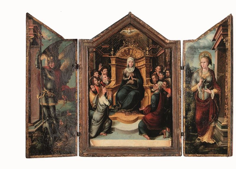 Scuola fiamminga del XVI secolo Trittico raffigurante la Madonna in trono con Santa Maddalena, l'arcangelo Michele e altri [..]