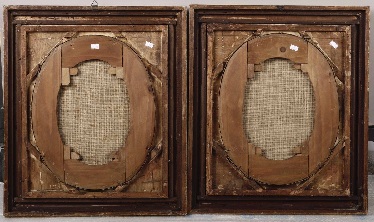 coppia di dipinti a olio su tela ovale, cm 42x33 entro cornici dorate