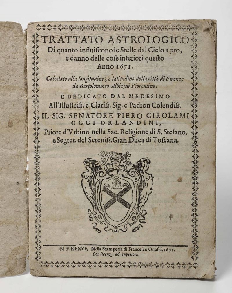 Trattato astrologico di quanto influiscono le stelle dal cielo a pro, e danno delle cose inferiori questo anno 1671. Calcolato alla longitudine,e latitudine della città di Firenze..In Firenze,Nella Stamperia di Francesco Onofri,1671