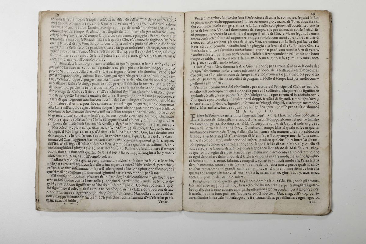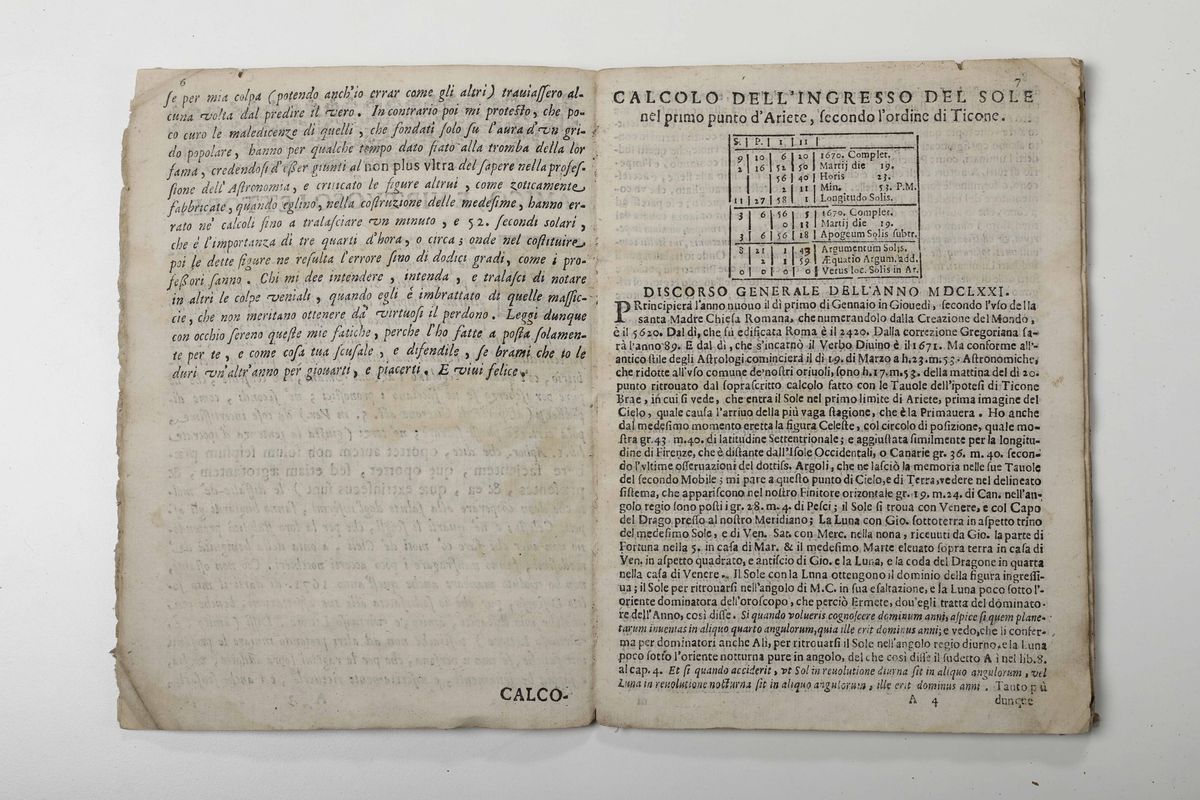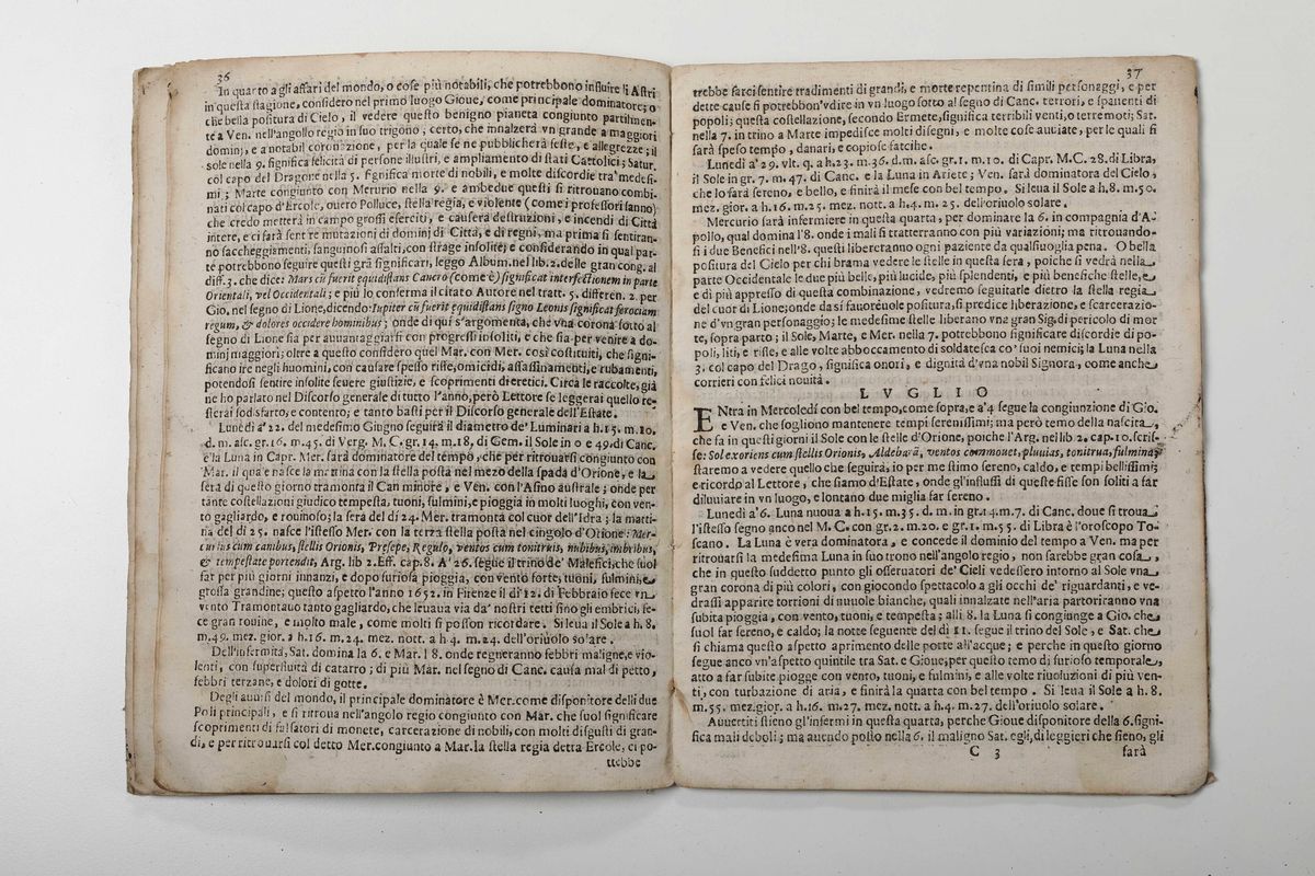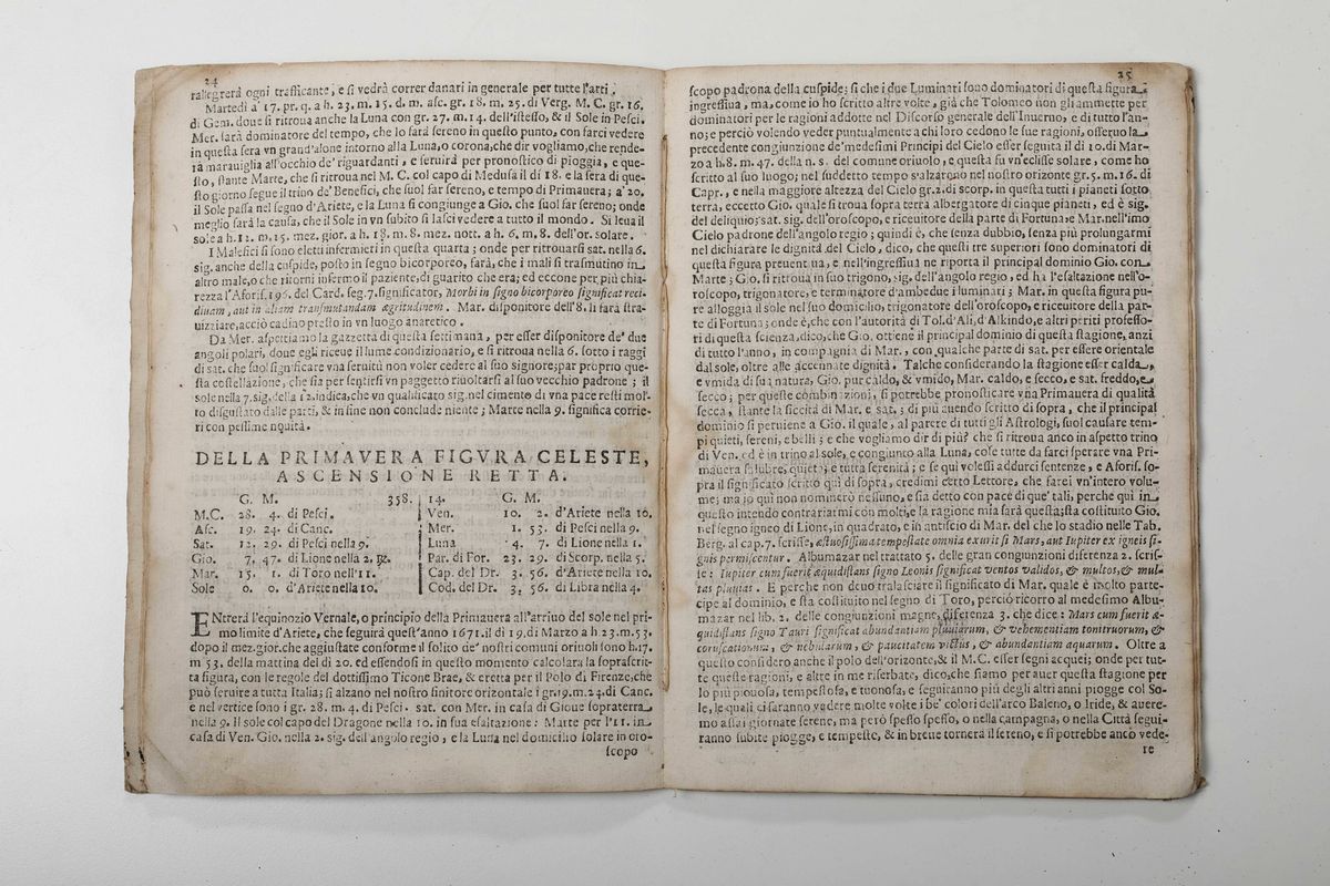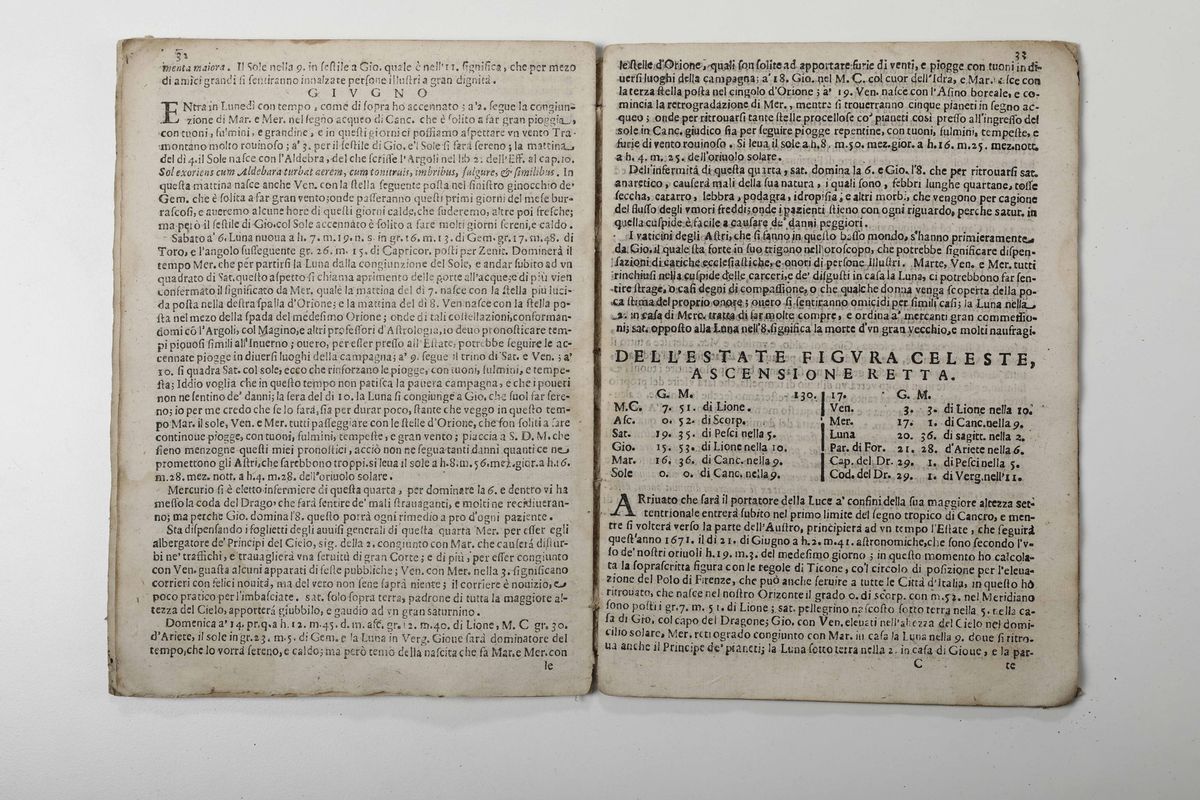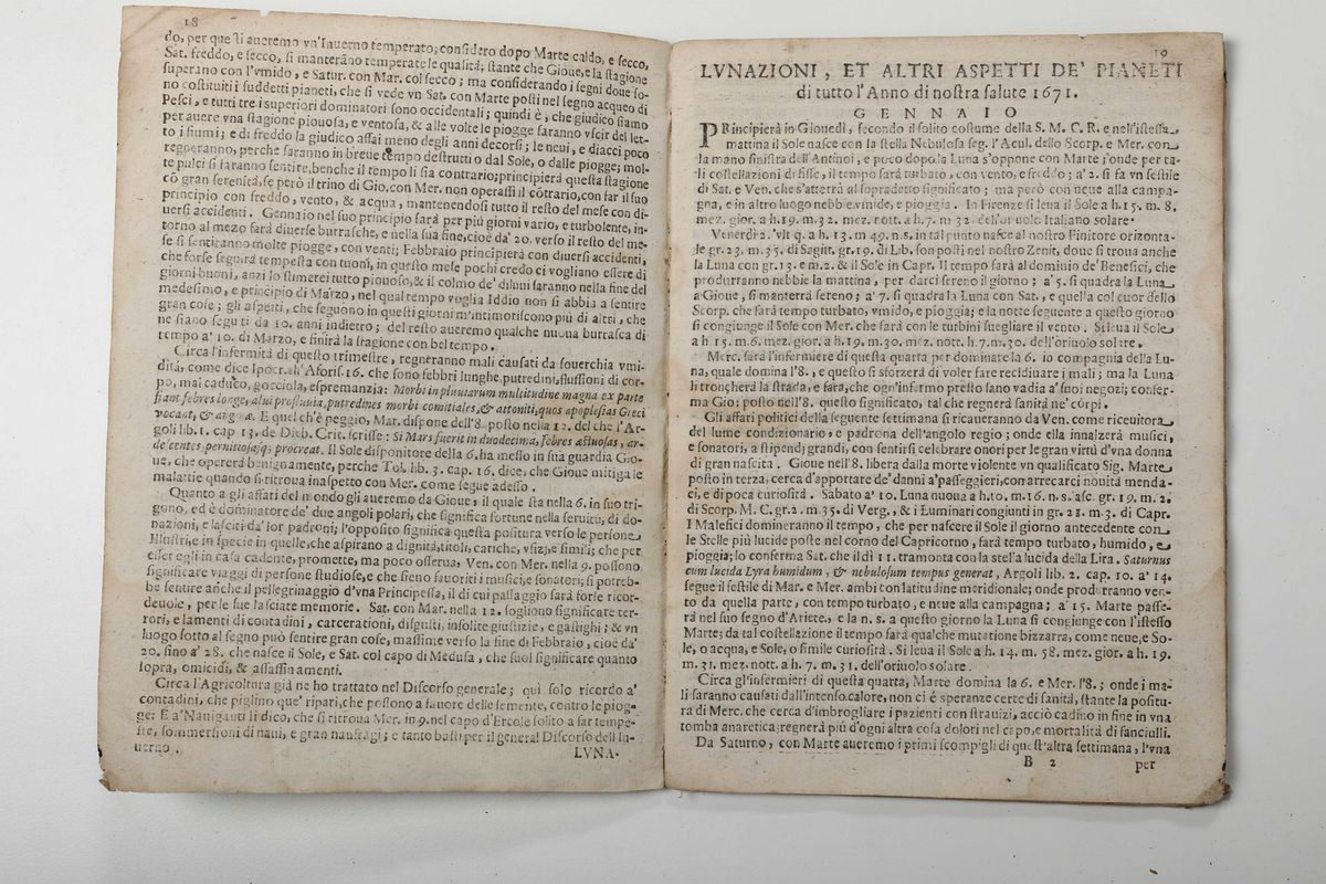 In-4°. 52 pp. Legatura coeva in cartonato alla rustica. Bruniture e gore. Raro trattato astrologico facente parte di una serie che fu pubblicata dal 1670 al 1727. La nostra pubblicazione riguarda il secondo anno in cui uscì. Bibliografia: Cantamessa I,104. Riccardi I,1 19 e II II, (edizioni del 1671,1678,1704,1714,1727).