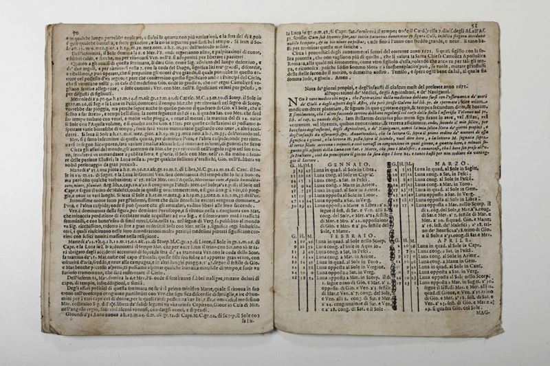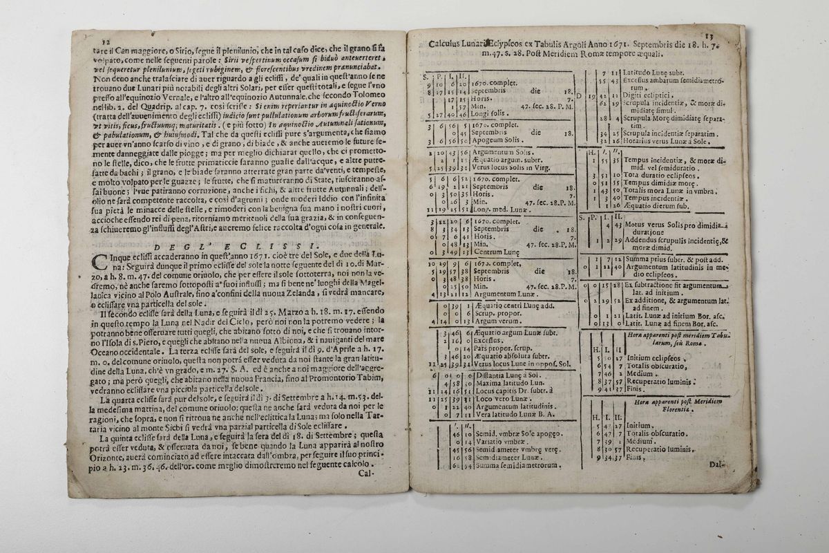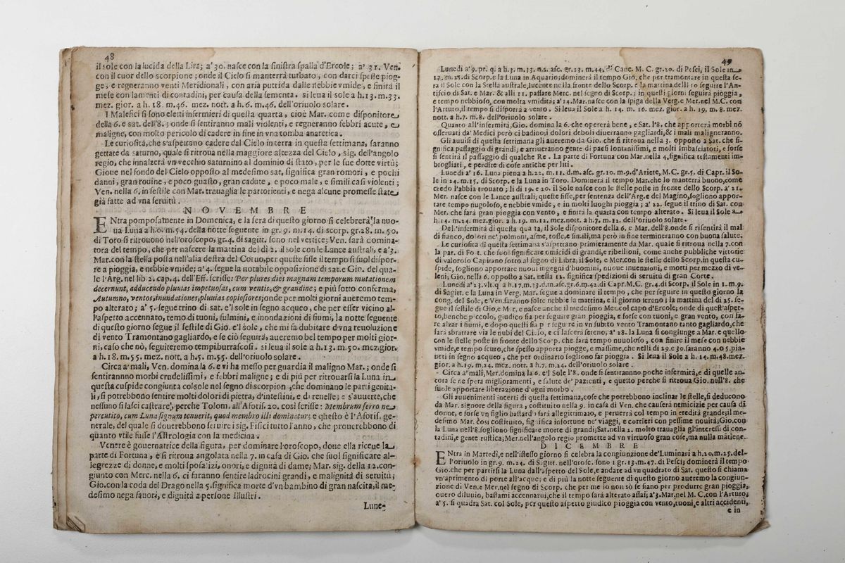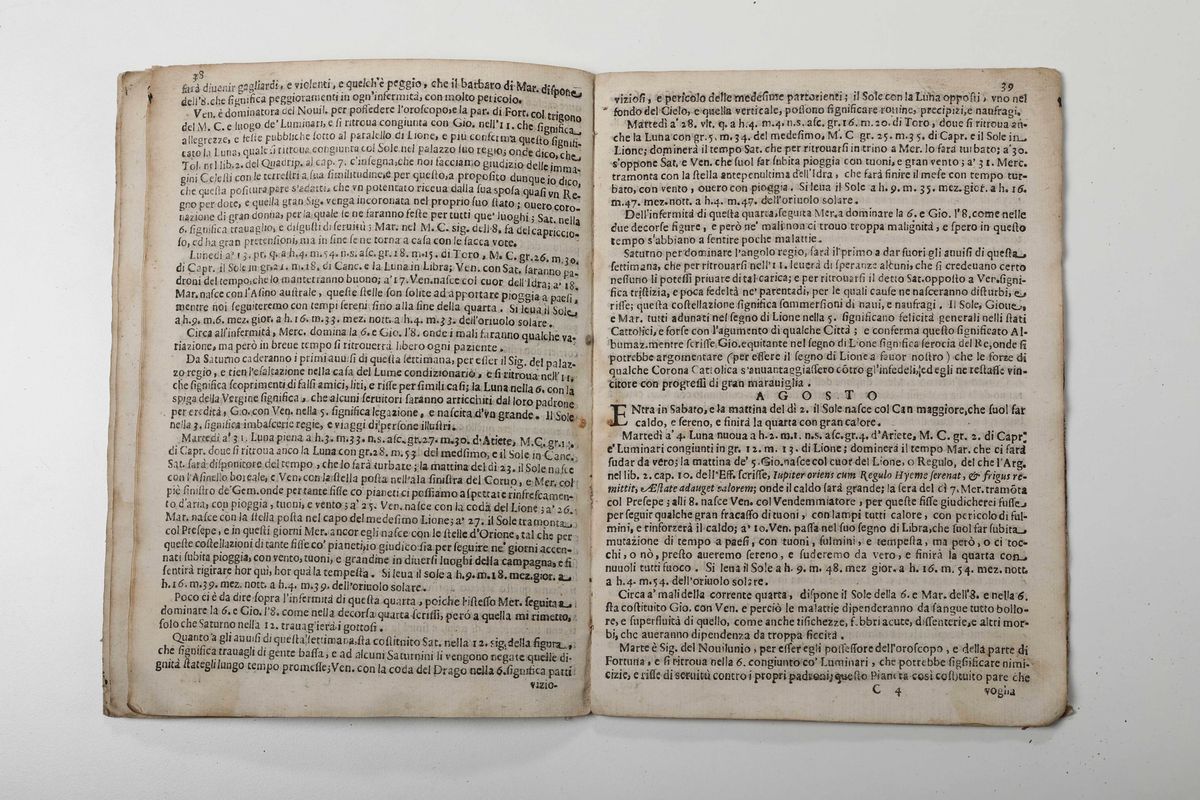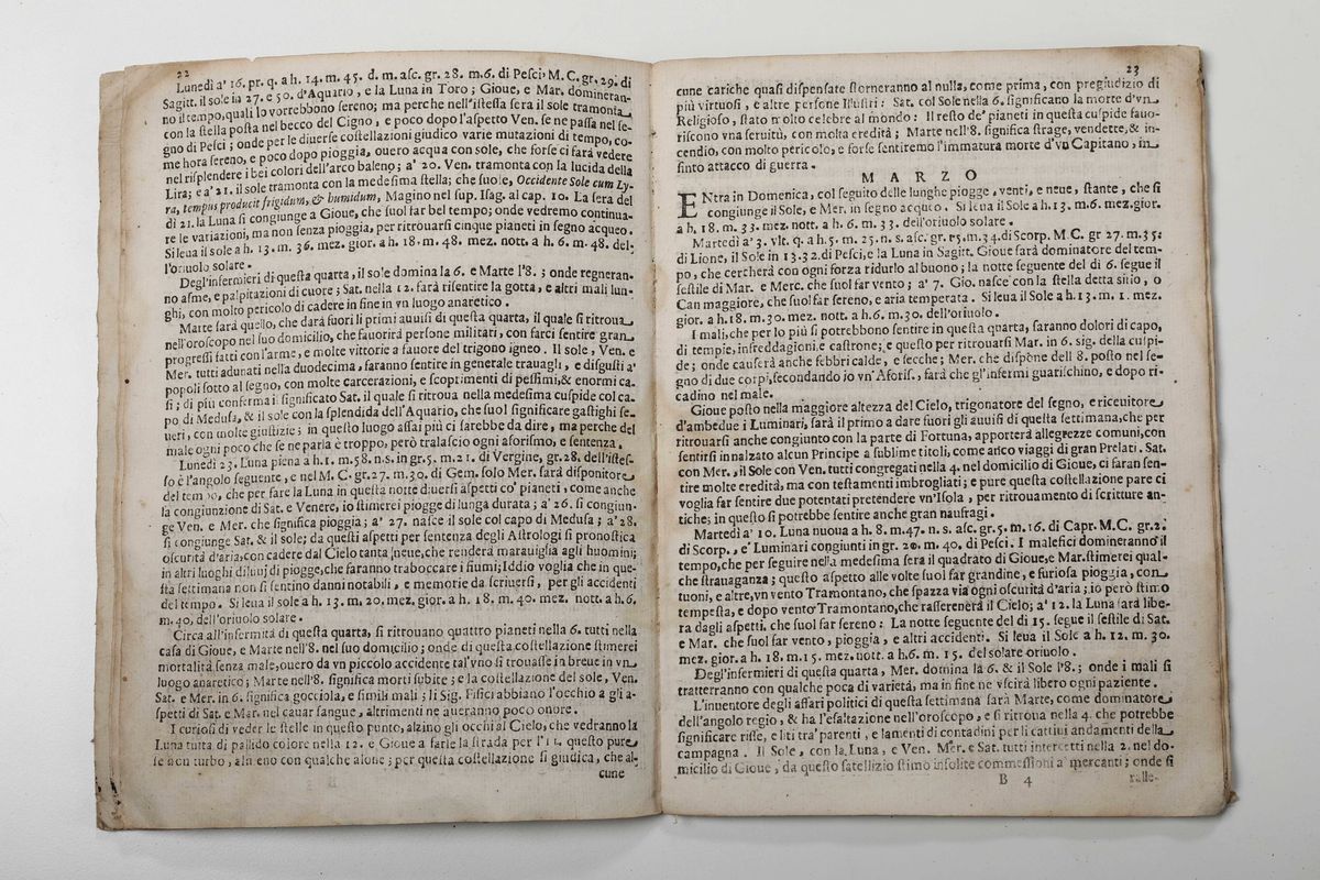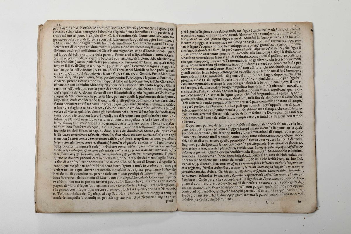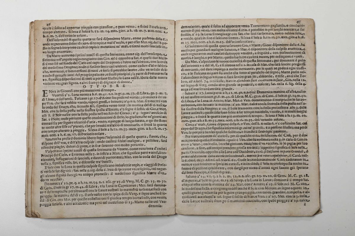 In-4°. 52 pp. Legatura coeva in cartonato alla rustica. Bruniture e gore. Raro trattato astrologico facente parte di una serie che fu pubblicata dal 1670 al 1727. La nostra pubblicazione riguarda il secondo anno in cui uscì. Bibliografia: Cantamessa I,104. Riccardi I,1 19 e II II, (edizioni del 1671,1678,1704,1714,1727).