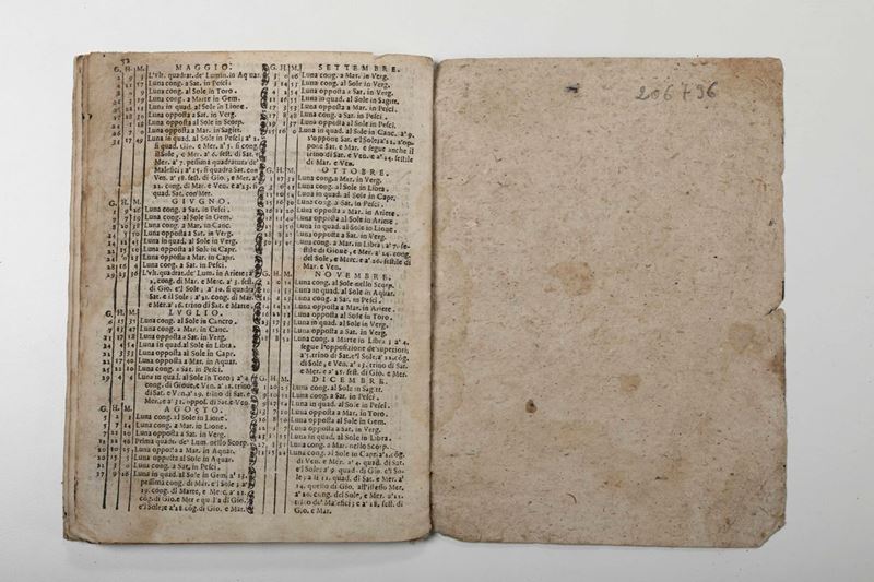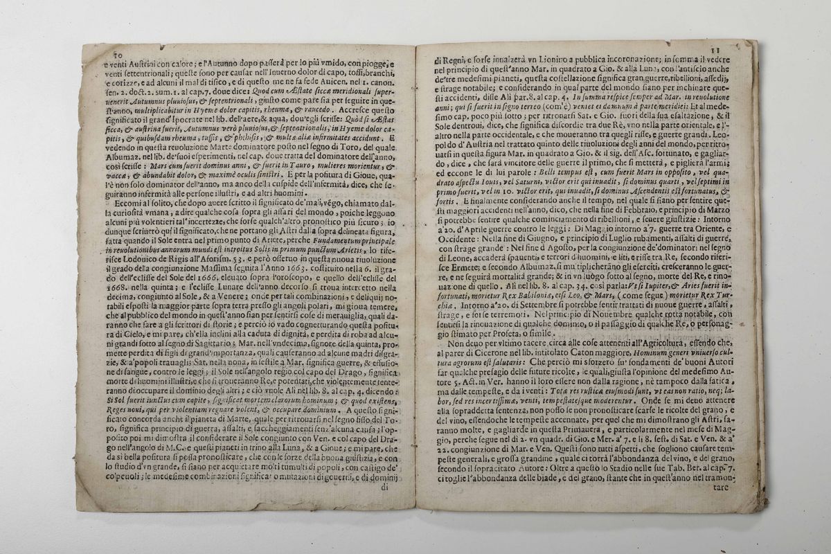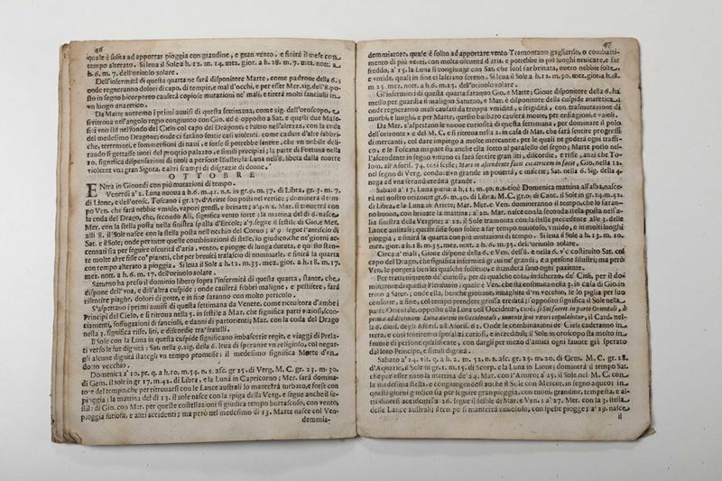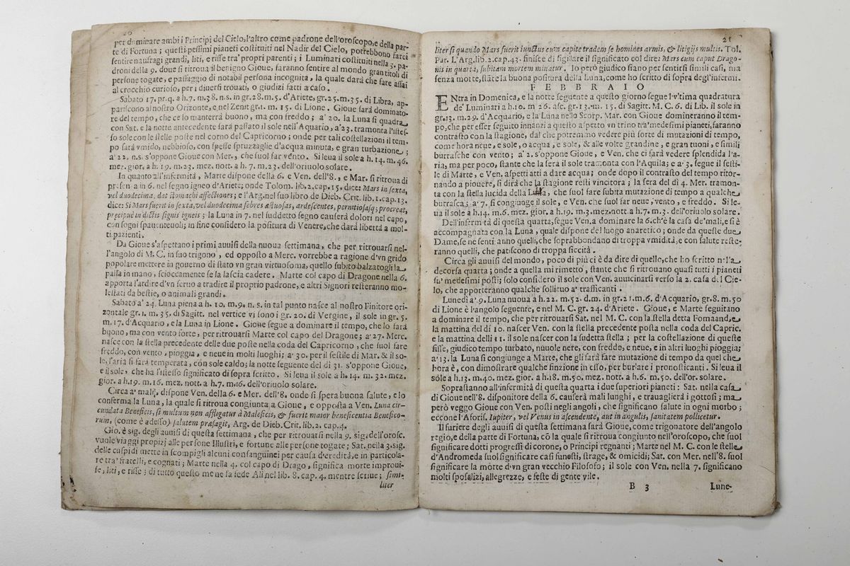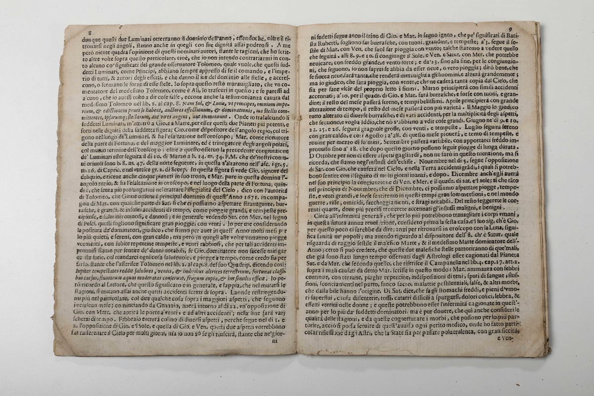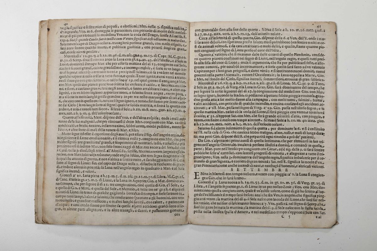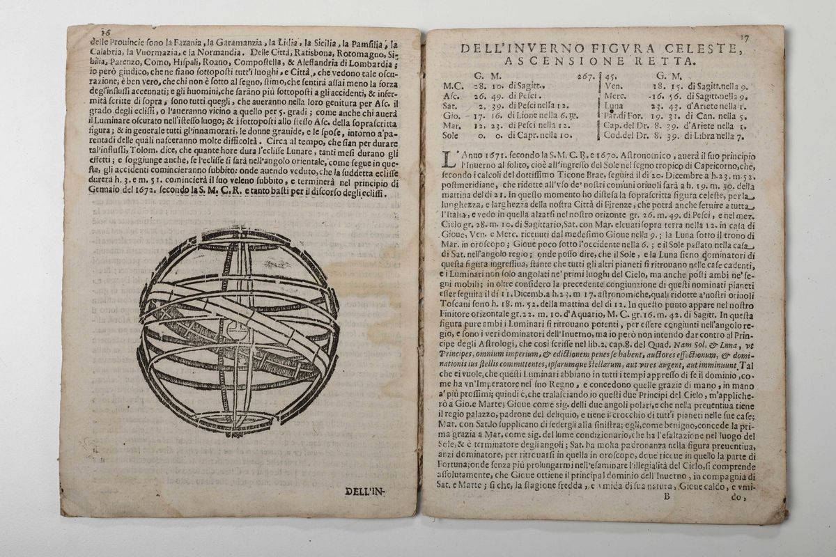 In-4°. 52 pp. Legatura coeva in cartonato alla rustica. Bruniture e gore. Raro trattato astrologico facente parte di una serie che fu pubblicata dal 1670 al 1727. La nostra pubblicazione riguarda il secondo anno in cui uscì. Bibliografia: Cantamessa I,104. Riccardi I,1 19 e II II, (edizioni del 1671,1678,1704,1714,1727).