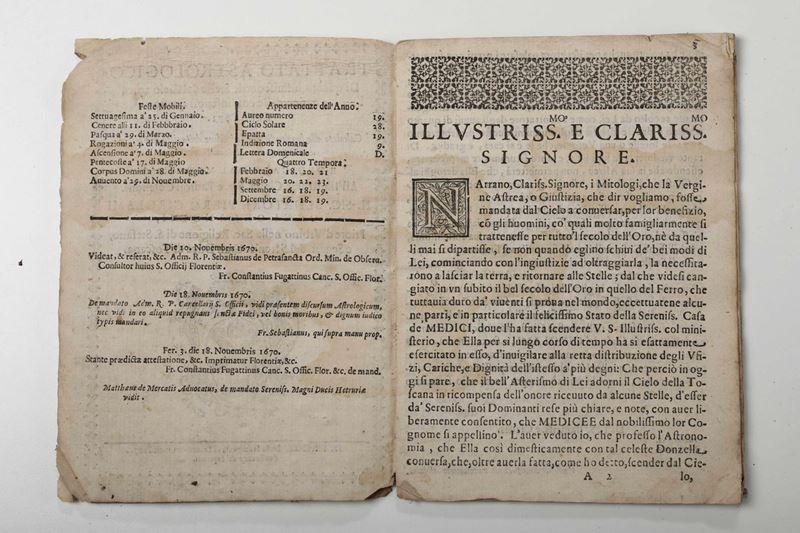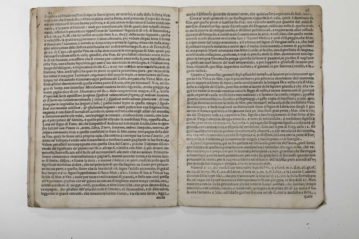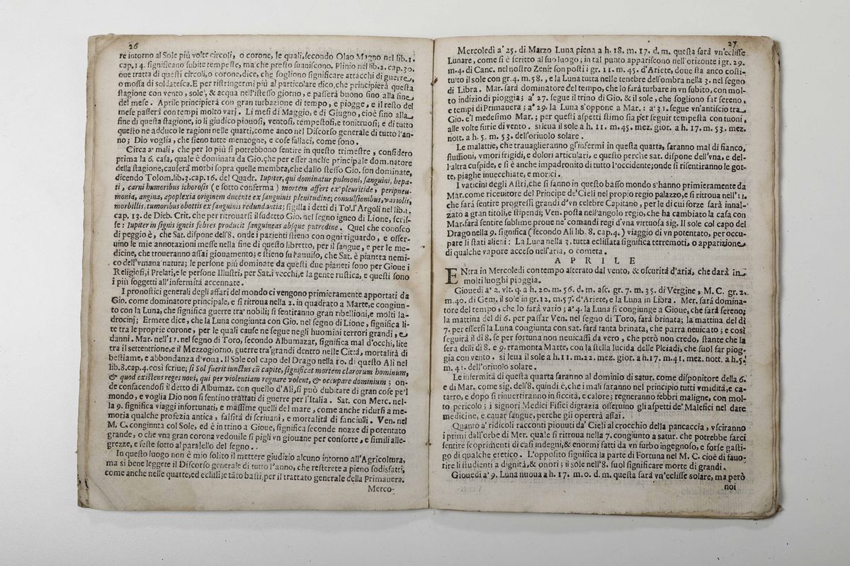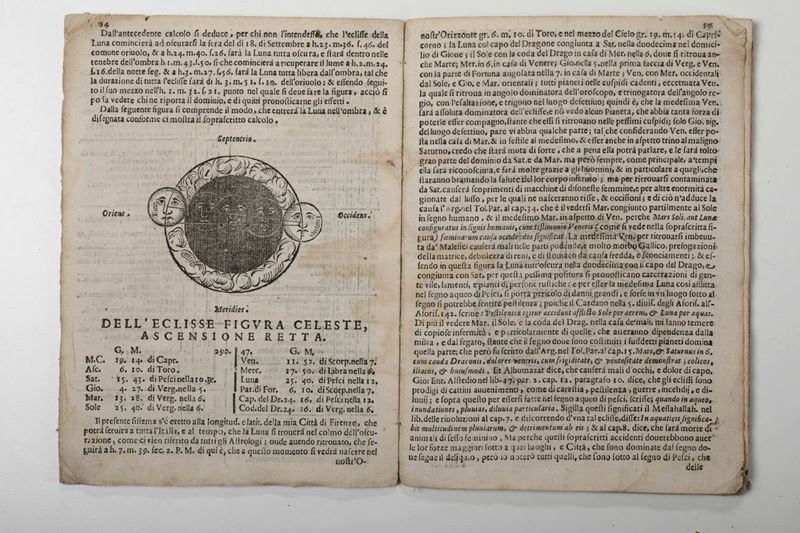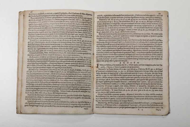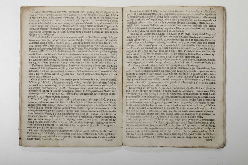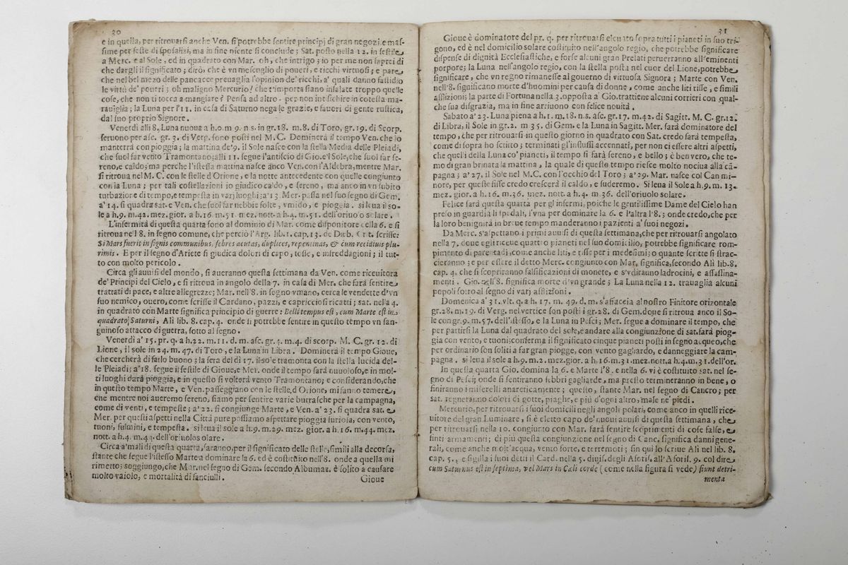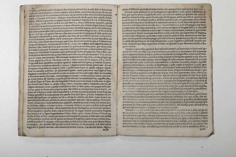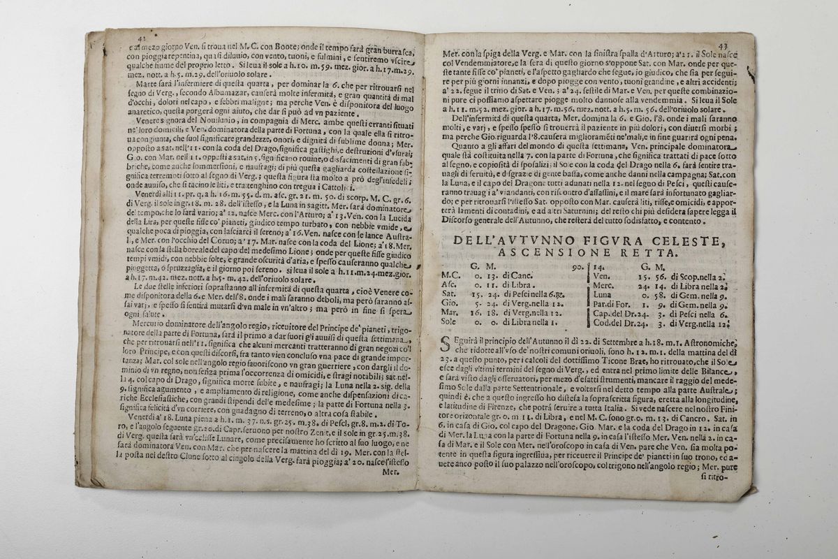 In-4°. 52 pp. Legatura coeva in cartonato alla rustica. Bruniture e gore. Raro trattato astrologico facente parte di una serie che fu pubblicata dal 1670 al 1727. La nostra pubblicazione riguarda il secondo anno in cui uscì. Bibliografia: Cantamessa I,104. Riccardi I,1 19 e II II, (edizioni del 1671,1678,1704,1714,1727).